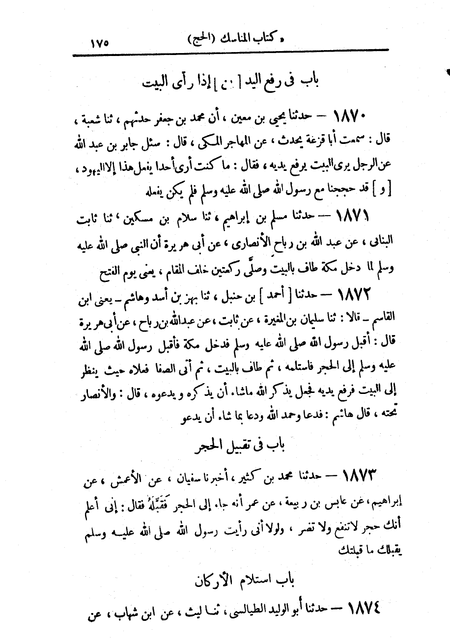 1870 - حَدَّثَنَا يَحْيَى بْنُ مُعِينٍ، أَنَّ مُحَمَّدَ بْنَ جَعْفَرٍ، حَدَّثَهُمْ حَدَّثَنَا شُعْبَةُ، قَالَ: سَمِعْتُ أَبَا قَزْعَةَ، يُحَدِّثُ، عَنِ الْمُهَاجِرِ الْمَكِّيِّ، قَالَ: سُئِلَ جَابِرُ بْنُ عَبْدِ اللَّهِ، عَنْ " الرَّجُلِ يَرَى الْبَيْتَ يَرْفَعُ يَدَيْهِ، فَقَالَ: «مَا كُنْتُ أَرَى أَحَدًا يَفْعَلُ هَذَا إِلَّا الْيَهُودَ وَقَدْ §حَجَجْنَا مَعَ رَسُولِ اللَّهِ صَلَّى اللهُ عَلَيْهِ وَسَلَّمَ فَلَمْ يَكُنْ يَفْعَلُهُ»