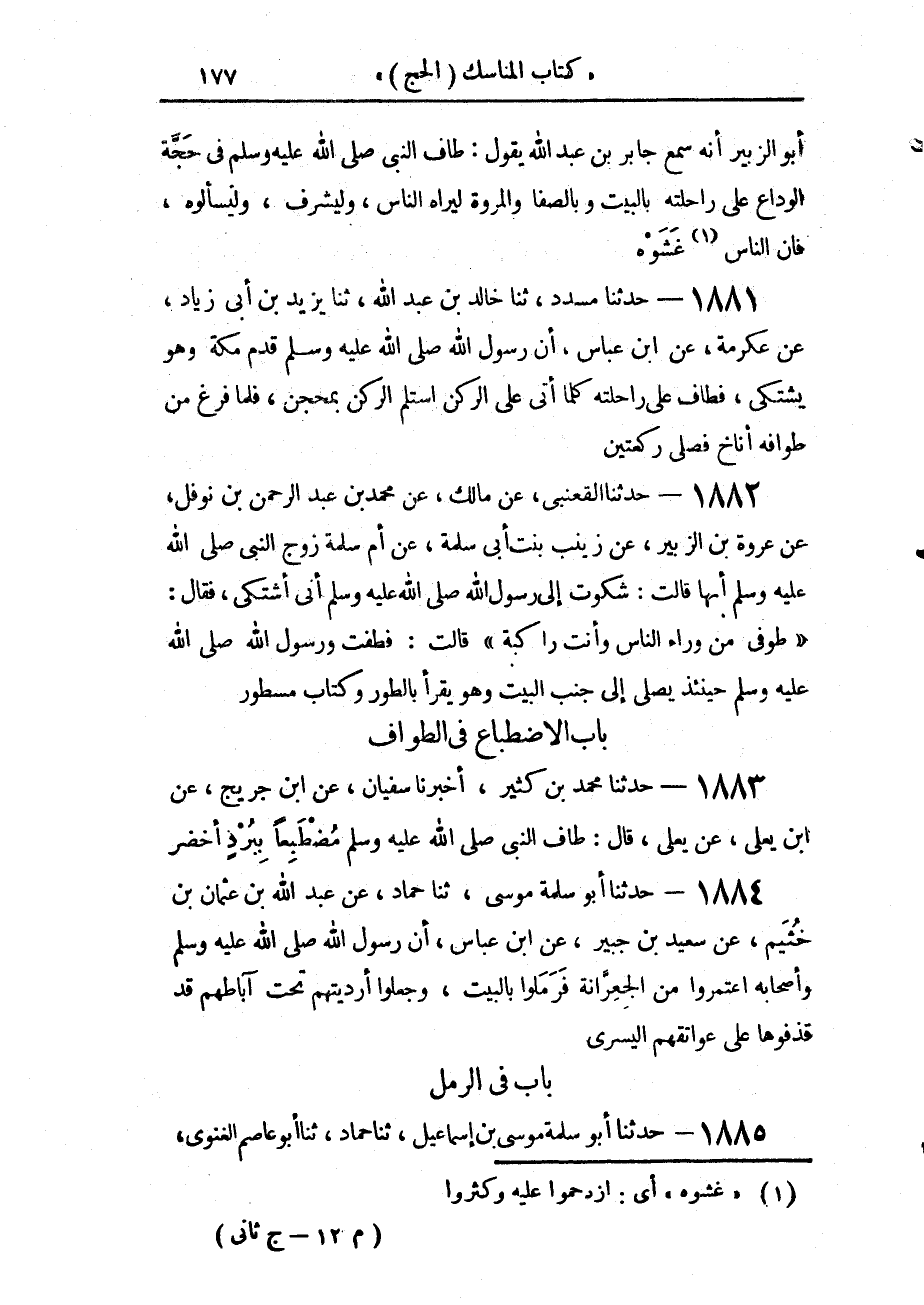 1885 - حَدَّثَنَا أَبُو سَلَمَةَ مُوسَى بْنُ إِسْمَاعِيلَ، حَدَّثَنَا حَمَّادٌ، حَدَّثَنَا أَبُو عَاصِمٍ الْغَنَوِيُّ -[178]-، عَنْ أَبِي الطُّفَيْلِ، قَالَ: قُلْتُ لِابْنِ عَبَّاسٍ: يَزْعُمُ قَوْمُكَ أَنَّ رَسُولَ اللَّهِ صَلَّى اللهُ عَلَيْهِ وَسَلَّمَ قَدْ رَمَلَ بِالْبَيْتِ وَأَنَّ ذَلِكَ سُنَّةٌ، قَالَ: صَدَقُوا وَكَذَبُوا، قُلْتُ: وَمَا صَدَقُوا، وَمَا كَذَبُوا، قَالَ: " صَدَقُوا، قَدْ رَمَلَ رَسُولُ اللَّهِ صَلَّى اللهُ عَلَيْهِ وَسَلَّمَ وَكَذَبُوا، لَيْسَ بِسُنَّةٍ إِنَّ قُرَيْشًا قَالَتْ زَمَنَ الْحُدَيْبِيَةِ دَعُوا مُحَمَّدًا وَأَصْحَابَهُ حَتَّى يَمُوتُوا مَوْتَ النَّغَفِ فَلَمَّا صَالَحُوهُ عَلَى أَنْ يَجِيئُوا مِنَ الْعَامِ الْمُقْبِلِ، فَيُقِيمُوا بِمَكَّةَ ثَلَاثَةَ أَيَّامٍ، فَقَدِمَ رَسُولُ اللَّهِ صَلَّى اللهُ عَلَيْهِ وَسَلَّمَ وَالْمُشْرِكُونَ مِنْ قِبَلِ قُعَيْقِعَانَ فَقَالَ رَسُولُ اللَّهِ صَلَّى اللهُ عَلَيْهِ وَسَلَّمَ لِأَصْحَابِهِ: «§ارْمُلُوا بِالْبَيْتِ ثَلَاثًا»، وَلَيْسَ بِسُنَّةٍ، قُلْتُ: يَزْعُمُ قَوْمُكَ أَنَّ رَسُولَ اللَّهِ صَلَّى اللهُ عَلَيْهِ وَسَلَّمَ طَافَ بَيْنَ الصَّفَا وَالْمَرْوَةِ عَلَى بَعِيرِهِ وَأَنَّ ذَلِكَ سُنَّةٌ، فَقَالَ: صَدَقُوا وَكَذَبُوا، قُلْتُ: مَا صَدَقُوا وَمَا كَذَبُوا؟ قَالَ: صَدَقُوا قَدْ طَافَ رَسُولُ اللَّهِ صَلَّى اللهُ عَلَيْهِ وَسَلَّمَ بَيْنَ الصَّفَا وَالْمَرْوَةِ عَلَى بَعِيرِهِ، وَكَذَبُوا لَيْسَ بِسُنَّةٍ، كَانَ النَّاسُ لَا يُدْفَعُونَ عَنْ رَسُولِ اللَّهِ صَلَّى اللهُ عَلَيْهِ وَسَلَّمَ وَلَا يُصْرَفُونَ عَنْهُ، فَطَافَ عَلَى بَعِيرٍ لِيَسْمَعُوا كَلَامَهُ وَلِيَرَوْا مَكَانَهُ وَلَا تَنَالُهُ أَيْدِيهِمْ