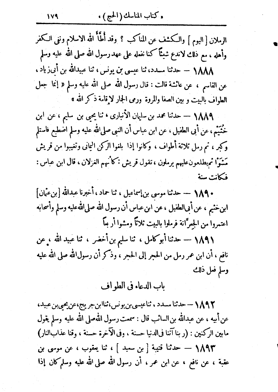 1893 - حَدَّثَنَا قُتَيْبَةُ بْنُ سَعِيدٍ، حَدَّثَنَا يَعْقُوبُ، عَنْ مُوسَى بْنِ عُقْبَةَ، عَنْ نَافِعٍ، عَنِ ابْنِ عُمَرَ، أَنَّ رَسُولَ اللَّهِ صَلَّى اللهُ عَلَيْهِ وَسَلَّمَ كَانَ «§إِذَا -[180]- طَافَ فِي الْحَجِّ وَالْعُمْرَةِ أَوَّلَ مَا يَقْدَمُ فَإِنَّهُ يَسْعَى ثَلَاثَةَ أَطْوَافٍ، وَيَمْشِي أَرْبَعًا ثُمَّ يُصَلِّي سَجْدَتَيْنِ»