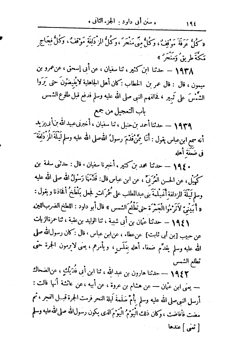 1939 - حَدَّثَنَا أَحْمَدُ بْنُ حَنْبَلٍ، حَدَّثَنَا سُفْيَانُ، أَخْبَرَنِي عُبَيْدُ اللَّهِ بْنُ أَبِي يَزِيدَ، أَنَّهُ سَمِعَ ابْنَ عَبَّاسٍ، يَقُولُ «§أَنَا مِمَّنْ قَدَّمَ رَسُولُ اللَّهِ صَلَّى اللهُ عَلَيْهِ وَسَلَّمَ لَيْلَةَ الْمُزْدَلِفَةِ فِي ضَعْفَةِ أَهْلِهِ»
