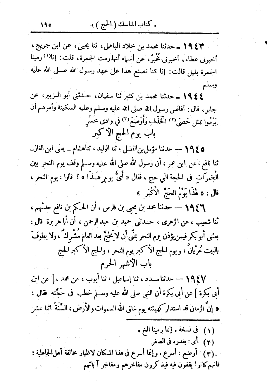 1946 - حَدَّثَنَا مُحَمَّدُ بْنُ يَحْيَى بْنِ فَارِسٍ، أَنَّ الْحَكَمَ بْنَ نَافِعٍ، حَدَّثَهُمْ حَدَّثَنَا شُعَيْبٌ، عَنِ الزُّهْرِيِّ، حَدَّثَنِي حُمَيْدُ بْنُ عَبْدِ الرَّحْمَنِ، أَنَّ أَبَا هُرَيْرَةَ، قَالَ: بَعَثَنِي أَبُو بَكْرٍ فِيمَنْ يُؤَذِّنُ يَوْمَ النَّحْرِ بِمِنًى «أَنْ §لَا يَحُجَّ بَعْدَ الْعَامِ مُشْرِكٌ، وَلَا يَطُوفَ بِالْبَيْتِ عُرْيَانٌ، وَيَوْمُ الْحَجِّ الْأَكْبَرِ، يَوْمُ النَّحْرِ وَالْحَجُّ الْأَكْبَرُ الْحَجُّ»