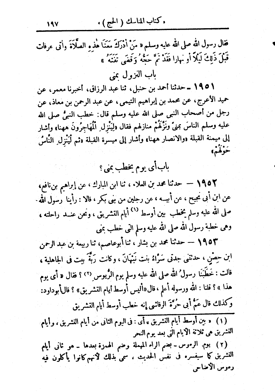 1952 - حَدَّثَنَا مُحَمَّدُ بْنُ الْعَلَاءِ، حَدَّثَنَا ابْنُ الْمُبَارَكِ، عَنْ إِبْرَاهِيمَ بْنِ نَافِعٍ، عَنِ ابْنِ أَبِي نَجِيحٍ، عَنْ أَبِيهِ، عَنْ رَجُلَيْنِ، مِنْ بَنِي بَكْرٍ، قَالَا: رَأَيْنَا رَسُولَ اللَّهِ صَلَّى اللهُ عَلَيْهِ وَسَلَّمَ «§يَخْطُبُ بَيْنَ أَوْسَطِ أَيَّامِ التَّشْرِيقِ، وَنَحْنُ عِنْدَ رَاحِلَتِهِ وَهِيَ خُطْبَةُ رَسُولِ اللَّهِ صَلَّى اللهُ عَلَيْهِ وَسَلَّمَ الَّتِي خَطَبَ بِمِنًى»