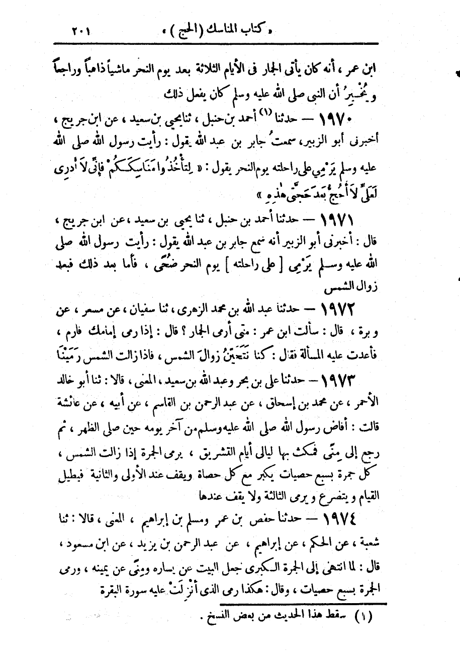 1970 - حَدَّثَنَا أَحْمَدُ بْنُ حَنْبَلٍ، حَدَّثَنَا يَحْيَى بْنُ سَعِيدٍ، عَنِ ابْنِ جُرَيْجٍ، أَخْبَرَنِي أَبُو الزُّبَيْرِ، سَمِعْتُ جَابِرَ بْنَ عَبْدِ اللَّهِ، يَقُولُ: رَأَيْتُ رَسُولَ اللَّهِ صَلَّى اللهُ عَلَيْهِ وَسَلَّمَ يَرْمِي عَلَى رَاحِلَتِهِ يَوْمَ النَّحْرِ يَقُولُ: «§لِتَأْخُذُوا مَنَاسِكَكُمْ، فَإِنِّي لَا أَدْرِي لَعَلِّي لَا أَحُجُّ بَعْدَ حَجَّتِي هَذِهِ»