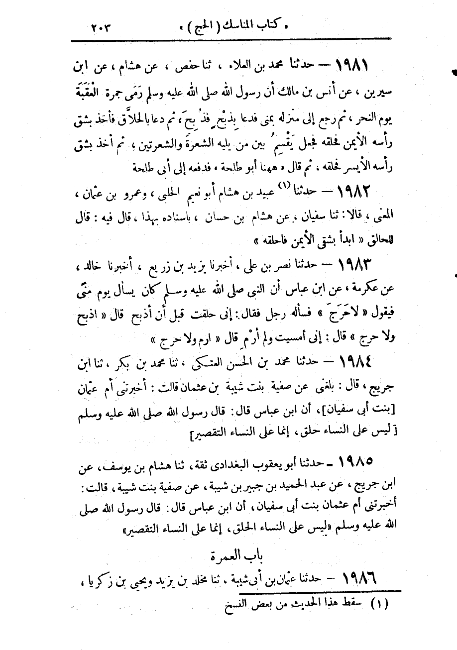 1984 - حَدَّثَنَا مُحَمَّدُ بْنُ الْحَسَنِ الْعَتَكِيُّ، حَدَّثَنَا مُحَمَّدُ بْنُ بَكْرٍ، حَدَّثَنَا ابْنُ جُرَيْجٍ، قَالَ: بَلَغَنِي، عَنْ صَفِيَّةَ بِنْتِ شَيْبَةَ بْنِ عُثْمَانَ، قَالَتْ: أَخْبَرَتْنِي أُمُّ عُثْمَانَ بِنْتُ أَبِي سُفْيَانَ، أَنَّ ابْنَ عَبَّاسٍ، قَالَ: قَالَ رَسُولُ اللَّهِ صَلَّى اللهُ عَلَيْهِ وَسَلَّمَ: «§لَيْسَ عَلَى النِّسَاءِ حَلْقٌ، إِنَّمَا عَلَى النِّسَاءِ التَّقْصِيرُ»