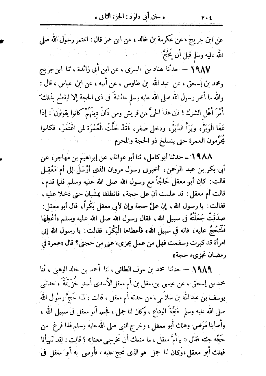 1989 - حَدَّثَنَا مُحَمَّدُ بْنُ عَوْفٍ الطَّائِيُّ، حَدَّثَنَا أَحْمَدُ بْنُ خَالِدٍ الْوَهْبِيُّ، حَدَّثَنَا مُحَمَّدُ بْنُ إِسْحَاقَ، عَنْ عِيسَى بْنِ مَعْقَلِ بْنِ أُمِّ مَعْقَلٍ الْأَسَدِيِّ أَسَدِ خُزَيْمَةَ، حَدَّثَنِي يُوسُفُ بْنُ عَبْدِ اللَّهِ بْنِ سَلَامٍ، عَنْ جَدَّتِهِ أُمِّ مَعْقَلٍ، قَالَتْ: لَمَّا حَجَّ رَسُولُ اللَّهِ صَلَّى اللهُ عَلَيْهِ وَسَلَّمَ حَجَّةَ الْوَدَاعِ وَكَانَ لَنَا جَمَلٌ، فَجَعَلَهُ أَبُو مَعْقِلٍ فِي سَبِيلِ اللَّهِ، وَأَصَابَنَا مَرَضٌ وَهَلَكَ أَبُو مَعْقِلٍ وَخَرَجَ النَّبِيُّ صَلَّى اللهُ عَلَيْهِ وَسَلَّمَ فَلَمَّا فَرَغَ مِنْ حَجِّهِ جِئْتُهُ، فَقَالَ: «يَا أُمَّ مَعْقِلٍ مَا مَنَعَكِ أَنْ تَخْرُجِي مَعَنَا؟»، قَالَتْ: لَقَدْ تَهَيَّأْنَا فَهَلَكَ أَبُو مَعْقِلٍ وَكَانَ لَنَا جَمَلٌ هُوَ الَّذِي نَحُجُّ عَلَيْهِ فَأَوْصَى بِهِ أَبُو مَعْقِلٍ فِي -[205]- سَبِيلِ اللَّهِ، قَالَ: «فَهَلَّا خَرَجْتِ عَلَيْهِ، فَإِنَّ الْحَجَّ فِي سَبِيلِ اللَّهِ، فَأَمَّا إِذْ فَاتَتْكِ هَذِهِ الْحَجَّةُ مَعَنَا §فَاعْتَمِرِي فِي رَمَضَانَ فَإِنَّهَا كَحَجَّةٍ» فَكَانَتْ تَقُولُ: الْحَجُّ حَجَّةٌ، وَالْعُمْرَةُ عُمْرَةٌ، وَقَدْ قَالَ: هَذَا لِي رَسُولُ اللَّهِ صَلَّى اللهُ عَلَيْهِ وَسَلَّمَ مَا أَدْرِي أَلِيَ خَاصَّةً