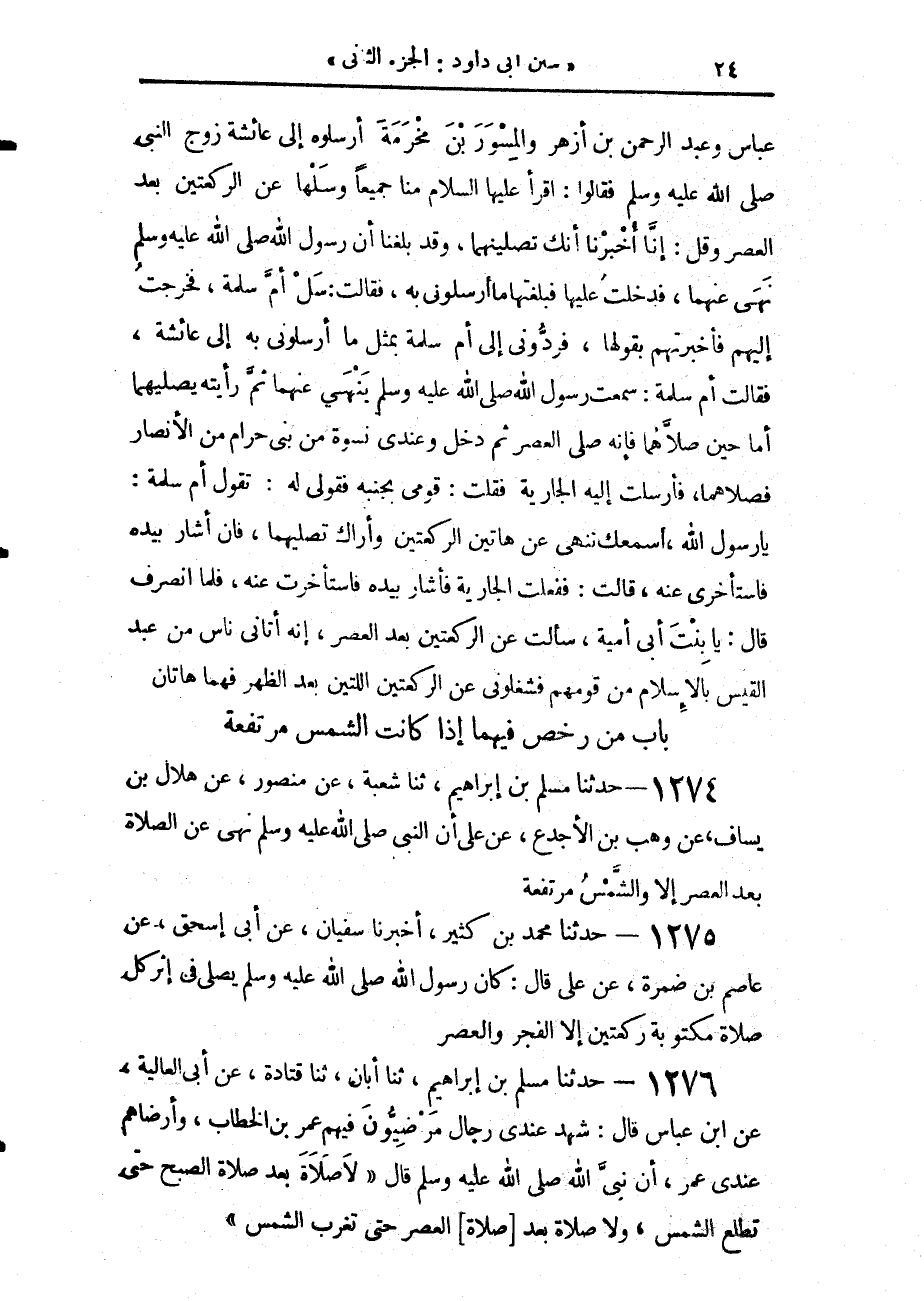 1275 - حَدَّثَنَا مُحَمَّدُ بْنُ كَثِيرٍ، أَخْبَرَنَا سُفْيَانُ، عَنْ أَبِي إِسْحَاقَ، عَنْ عَاصِمِ بْنِ ضَمْرَةَ، عَنْ عَلِيٍّ، قَالَ: «كَانَ رَسُولُ اللَّهِ صَلَّى اللهُ عَلَيْهِ وَسَلَّمَ §يُصَلِّي فِي إِثْرِ كُلِّ صَلَاةٍ مَكْتُوبَةٍ رَكْعَتَيْنِ، إِلَّا الْفَجْرَ وَالْعَصْرَ»