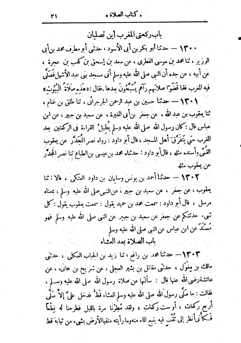 1301 - حَدَّثَنَا حُسَيْنُ بْنُ عَبْدِ الرَّحْمَنِ الْجَرْجَرَائِيُّ، حَدَّثَنَا طَلْقُ بْنُ غَنَّامٍ، حَدَّثَنَا يَعْقُوبُ بْنُ عَبْدِ اللَّهِ، عَنْ جَعْفَرِ بْنِ أَبِي الْمُغِيرَةِ، عَنْ سَعِيدِ بْنِ جُبَيْرٍ، عَنِ ابْنِ عَبَّاسٍ قَالَ: «كَانَ رَسُولُ اللَّهِ صَلَّى اللهُ عَلَيْهِ وَسَلَّمَ §يُطِيلُ الْقِرَاءَةَ فِي الرَّكْعَتَيْنِ بَعْدَ الْمَغْرِبِ، حَتَّى يَتَفَرَّقَ أَهْلُ الْمَسْجِدِ»، قَالَ أَبُو دَاوُدَ: رَوَاهُ نَصْرٌ الْمُجَدَّرُ، عَنْ يَعْقُوبَ الْقُمِّيِّ، وَأَسْنَدَهُ مِثْلَهُ. قَالَ أَبُو دَاوُدَ: حَدَّثَنَاه مُحَمَّدُ بْنُ عِيسَى بْنِ الطَّبَّاعِ، حَدَّثَنَا نَصْرٌ الْمُجَدَّرُ، عَنْ يَعْقُوبَ مِثْلَهُ.
