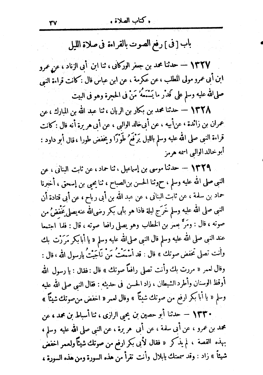 1329 - حَدَّثَنَا مُوسَى بْنُ إِسْمَاعِيلَ، حَدَّثَنَا حَمَّادٌ، عَنْ ثَابِتٍ الْبُنَانِيِّ، عَنِ النَّبِيِّ صَلَّى اللهُ عَلَيْهِ وَسَلَّمَ، ح وحَدَّثَنَا الْحَسَنُ بْنُ الصَّبَّاحِ، حَدَّثَنَا يَحْيَى بْنُ إِسْحَاقَ، أَخْبَرَنَا حَمَّادُ بْنُ سَلَمَةَ، عَنْ ثَابِتٍ الْبُنَانِيِّ، عَنْ عَبْدِ اللَّهِ بْنِ رَبَاحٍ، عَنْ أَبِي قَتَادَةَ، أَنَّ النَّبِيَّ صَلَّى اللهُ عَلَيْهِ وَسَلَّمَ §خَرَجَ لَيْلَةً، فَإِذَا هُوَ بِأَبِي بَكْرٍ رَضِيَ اللَّهُ عَنْهُ يُصَلِّي يَخْفِضُ مِنْ صَوْتِهِ، قَالَ: وَمَرَّ بِعُمَرَ بْنِ الْخَطَّابِ، وَهُوَ يُصَلِّي رَافِعًا صَوْتَهُ، قَالَ: فَلَمَّا اجْتَمَعَا عِنْدَ النَّبِيِّ صَلَّى اللهُ عَلَيْهِ وَسَلَّمَ، قَالَ: «يَا أَبَا بَكْرٍ، مَرَرْتُ بِكَ وَأَنْتَ تُصَلِّي تَخْفِضُ صَوْتَكَ»، قَالَ: قَدْ أَسْمَعْتُ مَنْ نَاجَيْتُ يَا رَسُولَ اللَّهِ، قَالَ: وَقَالَ لِعُمَرَ: «مَرَرْتُ بِكَ، وَأَنْتَ تُصَلِّي رَافِعًا صَوْتَكَ»، قَالَ: فَقَالَ: يَا رَسُولَ اللَّهِ، أُوقِظُ الْوَسْنَانَ، وَأَطْرُدُ الشَّيْطَانَ - زَادَ الْحَسَنُ فِي حَدِيثِهِ: - فَقَالَ النَّبِيُّ صَلَّى اللهُ عَلَيْهِ وَسَلَّمَ: «يَا أَبَا بَكْرٍ ارْفَعْ مِنْ صَوْتِكَ شَيْئًا»، وَقَالَ لِعُمَرَ: «اخْفِضْ مِنْ صَوْتِكَ شَيْئًا».
