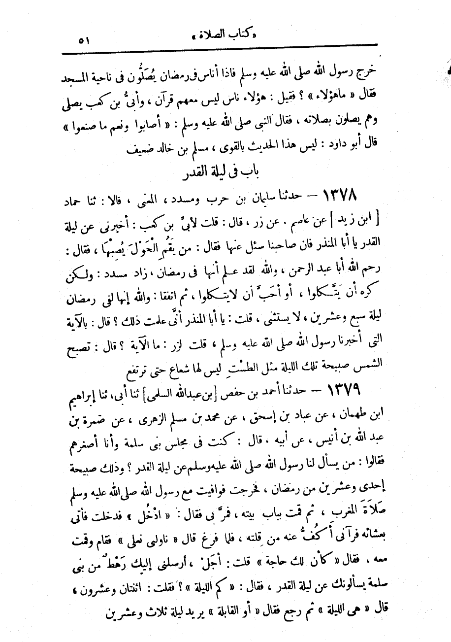 1378 - حَدَّثَنَا سُلَيْمَانُ بْنُ حَرْبٍ، وَمُسَدَّدٌ، الْمَعْنَى، قَالَا: حَدَّثَنَا حَمَّادُ بْنُ زَيْدٍ، عَنْ عَاصِمٍ، عَنْ زِرٍّ، قَالَ: قُلْتُ لِأُبَيِّ بْنِ كَعْبٍ: أَخْبِرْنِي عَنْ لَيْلَةِ الْقَدْرِ يَا أَبَا الْمُنْذِرِ، فَإِنَّ صَاحِبَنَا سُئِلَ عَنْهَا، فَقَالَ: مَنْ يَقُمِ الْحَوْلَ يُصِبْهَا، فَقَالَ: رَحِمَ اللَّهُ أَبَا عَبْدِ الرَّحْمَنِ، وَاللَّهِ لَقَدْ عَلِمَ أَنَّهَا فِي رَمَضَانَ - زَادَ مُسَدَّدٌ، وَلَكِنْ كَرِهَ أَنْ يَتَّكِلُوا أَوْ أَحَبَّ أَنْ لَا يَتَّكِلُوا، ثُمَّ اتَّفَقَا - وَاللَّهِ إِنَّهَا لَفِي رَمَضَانَ لَيْلَةَ سَبْعٍ وَعِشْرِينَ لَا يَسْتَثْنِي، قُلْتُ: يَا أَبَا الْمُنْذِرِ، أَنَّى عَلِمْتَ ذَلِكَ؟ قَالَ: بِالْآيَةِ الَّتِي أَخْبَرَنَا رَسُولُ اللَّهِ صَلَّى اللهُ عَلَيْهِ وَسَلَّمَ، قُلْتُ لِزِرٍّ: مَا الْآيَةُ؟ قَالَ: «§تُصْبِحُ الشَّمْسُ صَبِيحَةَ تِلْكَ اللَّيْلَةِ مِثْلَ الطَّسْتِ لَيْسَ لَهَا شُعَاعٌ، حَتَّى تَرْتَفِعَ»