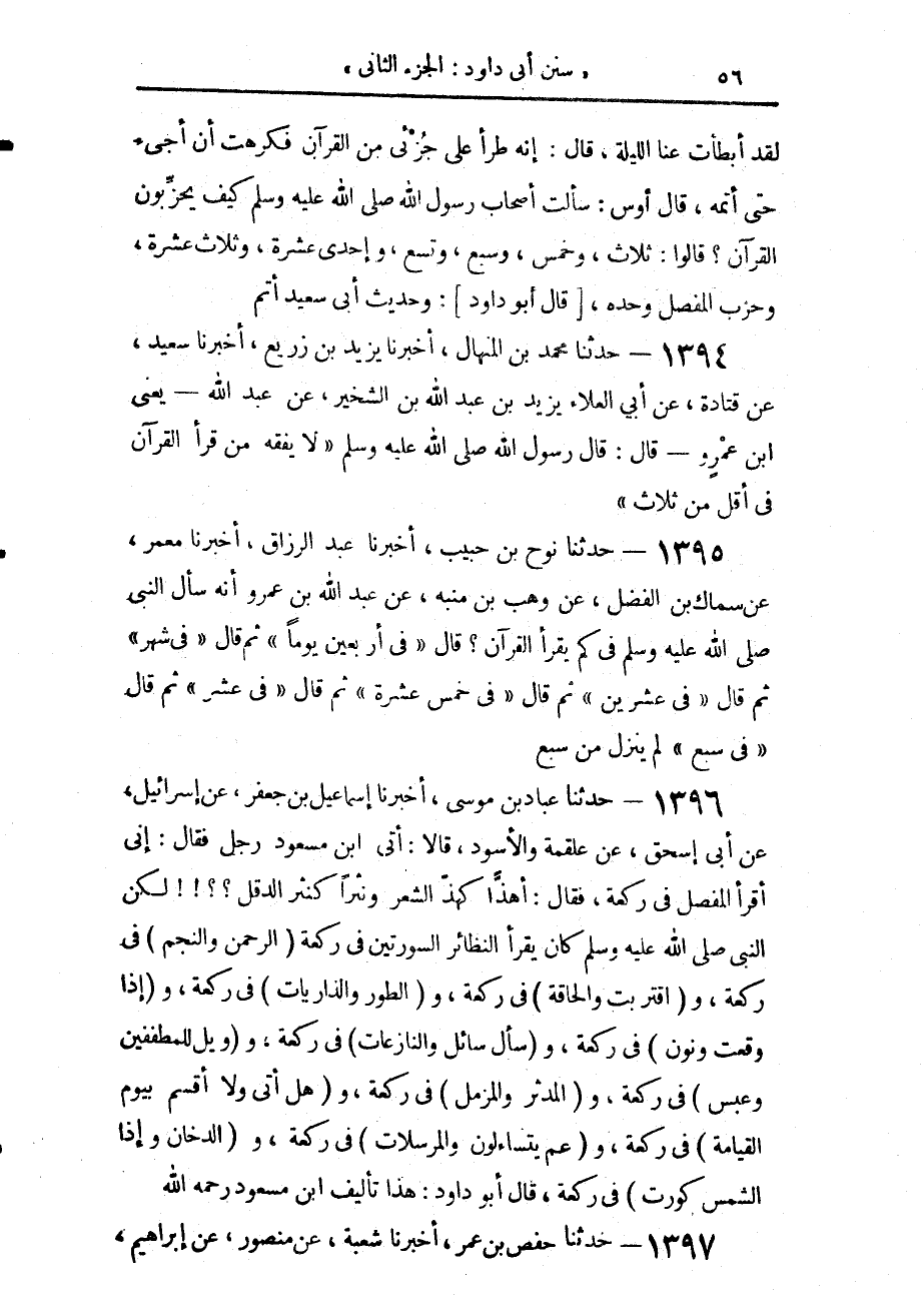 1396 - حَدَّثَنَا عَبَّادُ بْنُ مُوسَى، أَخْبَرَنَا إِسْمَاعِيلُ بْنُ جَعْفَرٍ، عَنْ إِسْرَائِيلَ، عَنْ أَبِي إِسْحَاقَ، عَنْ عَلْقَمَةَ، وَالْأَسْوَدِ، قَالَا: أَتَى ابْنَ مَسْعُودٍ رَجُلٌ، فَقَالَ: إِنِّي أَقْرَأُ الْمُفَصَّلَ فِي رَكْعَةٍ، فَقَالَ: أَهَذًّا كَهَذِّ الشِّعْرِ، وَنَثْرًا كَنَثْرِ الدَّقَلِ، «لَكِنَّ النَّبِيَّ صَلَّى اللهُ عَلَيْهِ وَسَلَّمَ كَانَ §يَقْرَأُ النَّظَائِرَ السُّورَتَيْنِ فِي رَكْعَةٍ، الرَّحْمَنَ وَالنَّجْمَ فِي رَكْعَةٍ، وَاقْتَرَبَتْ وَالْحَاقَّةَ فِي رَكْعَةٍ، وَالطُّورَ وَالذَّارِيَاتِ فِي رَكْعَةٍ، وَإِذَا وَقَعَتْ، وَنُونَ فِي رَكْعَةٍ، وَسَأَلَ سَائِلٌ وَالنَّازِعَاتِ فِي رَكْعَةٍ، وَوَيْلٌ لِلْمُطَفِّفِينَ وَعَبَسَ فِي رَكْعَةٍ، وَالْمُدَّثِّرَ وَالْمُزَّمِّلَ فِي رَكْعَةٍ، وَهَلْ أَتَى وَلَا أُقْسِمُ بِيَوْمِ الْقِيَامَةِ فِي رَكْعَةٍ، وَعَمَّ يَتَسَاءَلُونَ وَالْمُرْسَلَاتِ فِي رَكْعَةٍ، وَالدُّخَانَ وَإِذَا الشَّمْسُ كُوِّرَتْ فِي رَكْعَةٍ»، قَالَ أَبُو دَاوُدَ: «هَذَا تَأْلِيفُ ابْنِ مَسْعُودٍ رَحِمَهُ اللَّهُ»