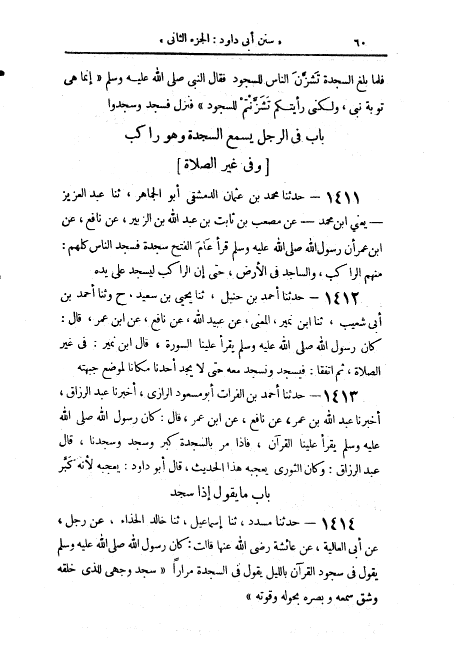1413 - حَدَّثَنَا أَحْمَدُ بْنُ الْفُرَاتِ أَبُو مَسْعُودٍ الرَّازِيُّ، أَخْبَرَنَا عَبْدُ الرَّزَّاقِ، أَخْبَرَنَا عَبْدُ اللَّهِ بْنُ عُمَرَ، عَنْ نَافِعٍ، عَنِ ابْنِ عُمَرَ، قَالَ: «كَانَ رَسُولُ اللَّهِ صَلَّى اللهُ عَلَيْهِ وَسَلَّمَ §يَقْرَأُ عَلَيْنَا الْقُرْآنَ، فَإِذَا مَرَّ بِالسَّجْدَةِ كَبَّرَ، وَسَجَدَ وَسَجَدْنَا مَعَهُ»، قَالَ عَبْدُ الرَّزَّاقِ: وَكَانَ الثَّوْرِيُّ يُعْجِبُهُ هَذَا الْحَدِيثُ، قَالَ أَبُو دَاوُدَ: «يُعْجِبُهُ لِأَنَّهُ كَبَّرَ»