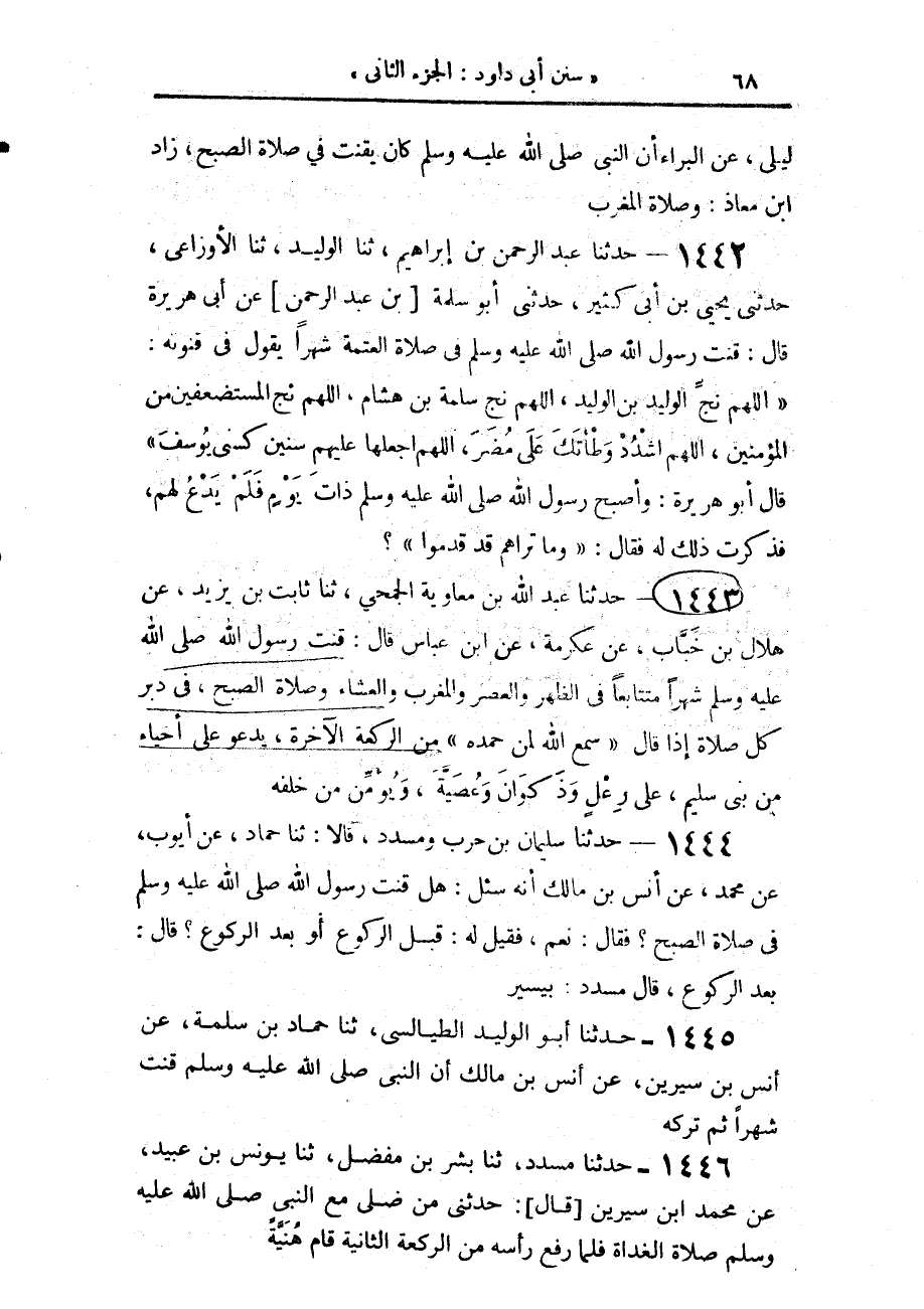 1446 - حَدَّثَنَا مُسَدَّدٌ، حَدَّثَنَا بِشْرُ بْنُ مُفَضَّلٍ، حَدَّثَنَا يُونُسُ بْنُ عُبَيْدٍ، عَنْ مُحَمَّدِ بْنِ سِيرِينَ، قَالَ: حَدَّثَنِي مَنْ «صَلَّى مَعَ النَّبِيِّ صَلَّى اللهُ عَلَيْهِ وَسَلَّمَ صَلَاةَ الْغَدَاةِ، §فَلَمَّا رَفَعَ رَأْسَهُ مِنَ الرَّكْعَةِ الثَّانِيَةِ، قَامَ هُنَيَّةً»
