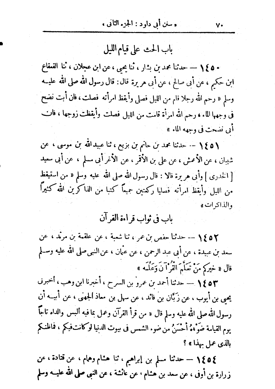 1450 - حَدَّثَنَا مُحَمَّدُ بْنُ بَشَّارٍ، حَدَّثَنَا يَحْيَى، عَنِ ابْنِ عَجْلَانَ، حَدَّثَنَا الْقَعْقَاعُ بْنُ حَكِيمٍ، عَنْ أَبِي صَالِحٍ، عَنْ أَبِي هُرَيْرَةَ، قَالَ: قَالَ رَسُولُ اللَّهِ صَلَّى اللهُ عَلَيْهِ وَسَلَّمَ: «§رَحِمَ اللَّهُ رَجُلًا قَامَ مِنَ اللَّيْلِ فَصَلَّى، وَأَيْقَظَ امْرَأَتَهُ فَصَلَّتْ، فَإِنْ أَبَتْ نَضَحَ فِي وَجْهِهَا الْمَاءَ، رَحِمَ اللَّهُ امْرَأَةً قَامَتْ مِنَ اللَّيْلِ فَصَلَّتْ، وَأَيْقَظَتْ زَوْجَهَا، فَإِنْ أَبَى نَضَحَتْ فِي وَجْهِهِ الْمَاءَ»