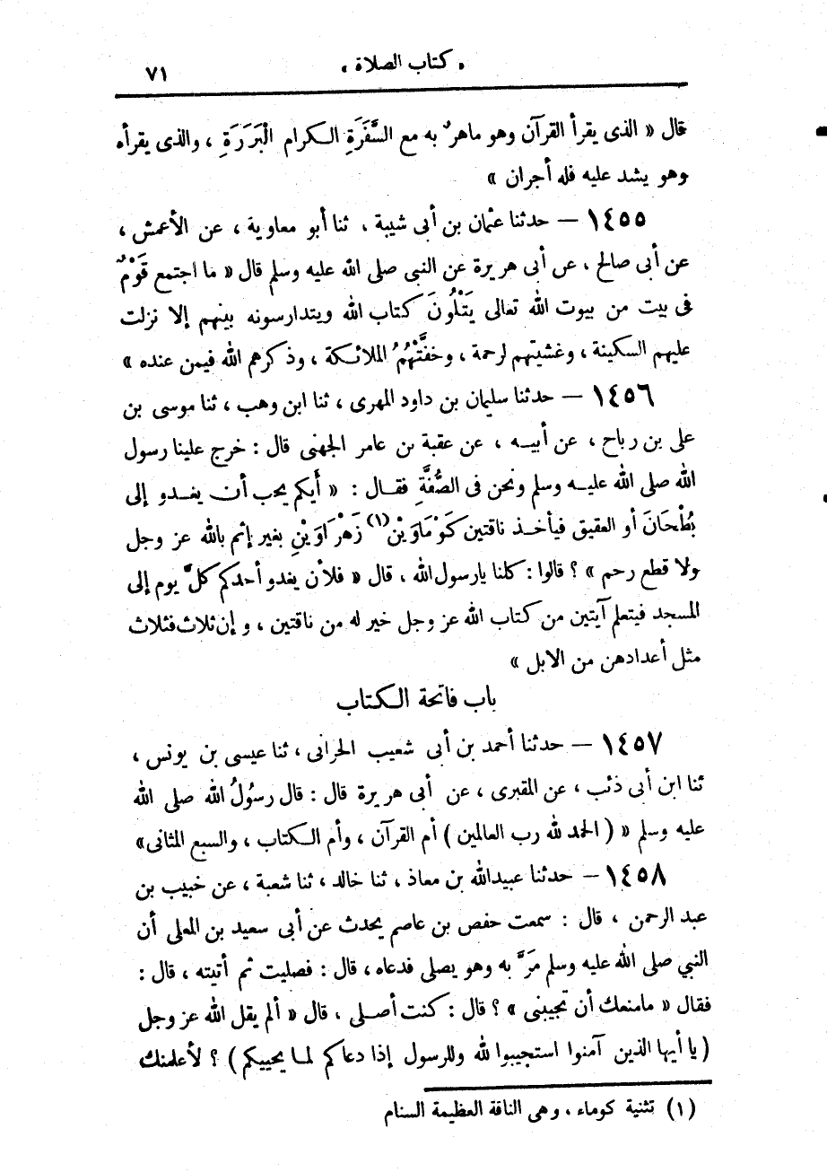 1456 - حَدَّثَنَا سُلَيْمَانُ بْنُ دَاوُدَ الْمَهْرِيُّ، حَدَّثَنَا ابْنُ وَهْبٍ، حَدَّثَنَا مُوسَى بْنُ عَلِيِّ بْنِ رَبَاحٍ، عَنْ أَبِيهِ، عَنْ عُقْبَةَ بْنِ عَامِرٍ الْجُهَنِيِّ، قَالَ: خَرَجَ عَلَيْنَا رَسُولُ اللَّهِ صَلَّى اللهُ عَلَيْهِ وَسَلَّمَ وَنَحْنُ فِي الصُّفَّةِ، فَقَالَ: «أَيُّكُمْ يُحِبُّ أَنْ يَغْدُوَ إِلَى بُطْحَانَ - أَوِ الْعَقِيقِ - فَيَأْخُذَ نَاقَتَيْنِ كَوْمَاوَيْنِ زَهْرَاوَيْنِ بِغَيْرِ إِثْمٍ بِاللَّهِ عَزَّ وَجَلَّ، وَلَا قَطْعِ رَحِمٍ؟» قَالُوا: كُلُّنَا يَا رَسُولَ اللَّهِ، قَالَ: «§فَلَأَنْ يَغْدُوَ أَحَدُكُمْ كُلَّ يَوْمٍ إِلَى الْمَسْجِدِ، فَيَتَعَلَّمَ آيَتَيْنِ مِنْ كِتَابِ اللَّهِ عَزَّ وَجَلَّ، خَيْرٌ لَهُ مِنْ نَاقَتَيْنِ، وَإِنْ ثَلَاثٌ فَثَلَاثٌ مِثْلُ أَعْدَادِهِنَّ مِنَ الْإِبِلِ»