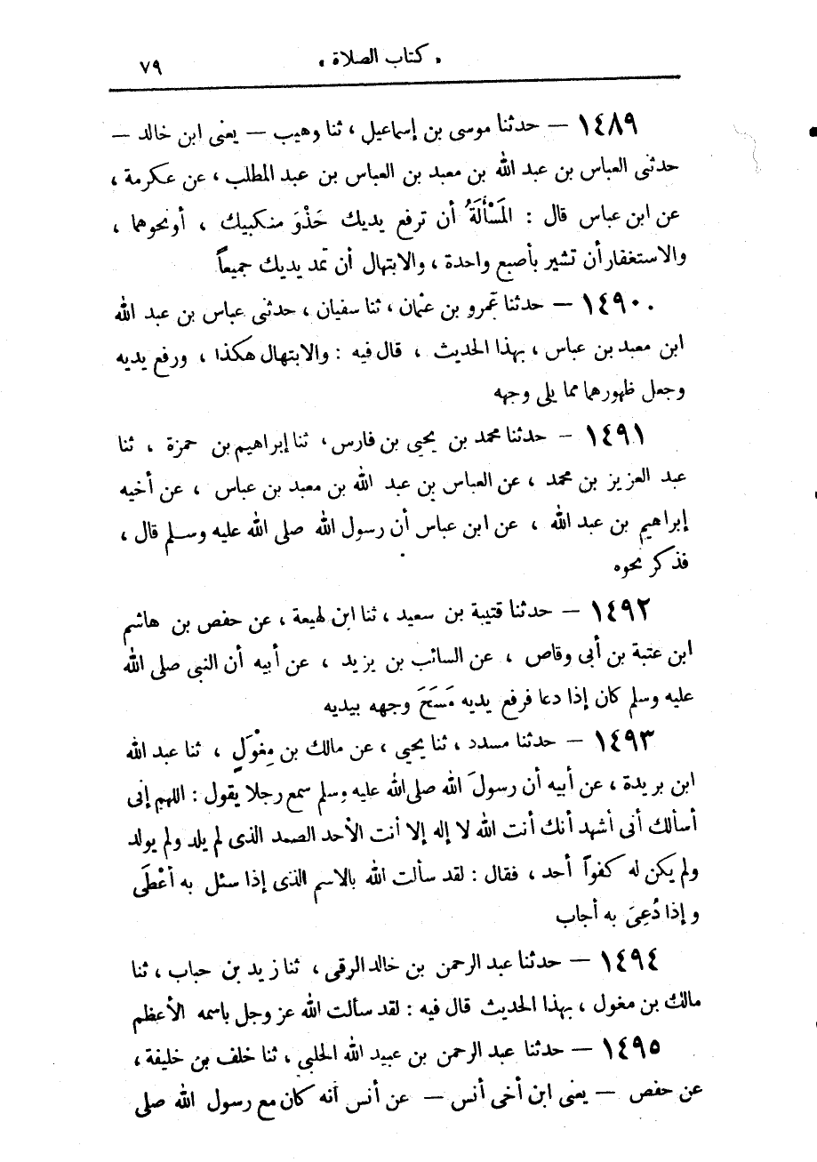 1489 - حَدَّثَنَا مُوسَى بْنُ إِسْمَاعِيلَ، حَدَّثَنَا وُهَيْبٌ يَعْنِي ابْنَ خَالِدٍ، حَدَّثَنِي الْعَبَّاسُ بْنُ عَبْدِ اللَّهِ بْنِ مَعْبَدِ بْنِ الْعَبَّاسِ بْنِ عَبْدِ الْمُطَّلِبِ، عَنْ عِكْرِمَةَ، عَنِ ابْنِ عَبَّاسٍ، قَالَ: «§الْمَسْأَلَةُ أَنْ تَرْفَعَ يَدَيْكَ حَذْوَ مَنْكِبَيْكَ، أَوْ نَحْوَهُمَا، وَالِاسْتِغْفَارُ أَنْ تُشِيرَ بِأُصْبُعٍ وَاحِدَةٍ، وَالِابْتِهَالُ أَنْ تَمُدَّ يَدَيْكَ جَمِيعًا»،