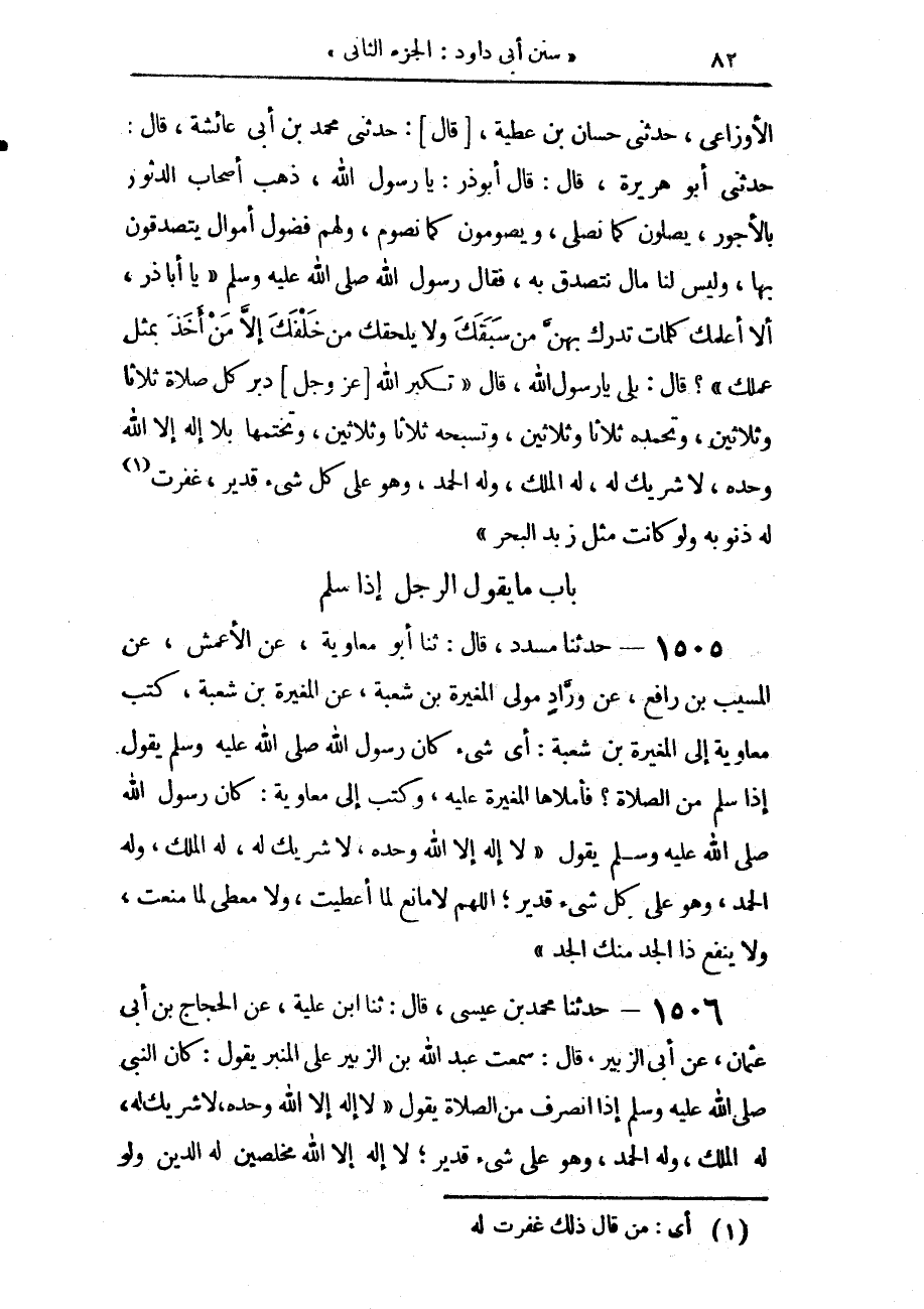 1505 - حَدَّثَنَا مُسَدَّدٌ، قَالَ: حَدَّثَنَا أَبُو مُعَاوِيَةَ، عَنِ الْأَعْمَشِ، عَنِ الْمُسَيَّبِ بْنِ رَافِعٍ، عَنْ وَرَّادٍ، مَوْلَى الْمُغِيرَةِ بْنِ شُعْبَةَ، عَنِ الْمُغِيرَةِ بْنِ شُعْبَةَ، كَتَبَ مُعَاوِيَةُ إِلَى الْمُغِيرَةِ بْنِ شُعْبَةَ، أَيُّ شَيْءٍ كَانَ رَسُولُ اللَّهِ صَلَّى اللهُ عَلَيْهِ وَسَلَّمَ يَقُولُ إِذَا سَلَّمَ مِنَ الصَّلَاةِ؟ فَأَمْلَاهَا الْمُغِيرَةُ عَلَيْهِ، وَكَتَبَ إِلَى مُعَاوِيَةَ، قَالَ: كَانَ رَسُولُ اللَّهِ صَلَّى اللهُ عَلَيْهِ وَسَلَّمَ يَقُولُ: «§لَا إِلَهَ إِلَّا اللَّهُ وَحْدَهُ لَا شَرِيكَ لَهُ، لَهُ الْمُلْكُ، وَلَهُ الْحَمْدُ، وَهُوَ عَلَى كُلِّ شَيْءٍ قَدِيرٌ، اللَّهُمَّ لَا مَانِعَ لِمَا أَعْطَيْتَ، وَلَا مُعْطِيَ لِمَا مَنَعْتَ، وَلَا يَنْفَعُ ذَا الْجَدِّ مِنْكَ الْجَدُّ»