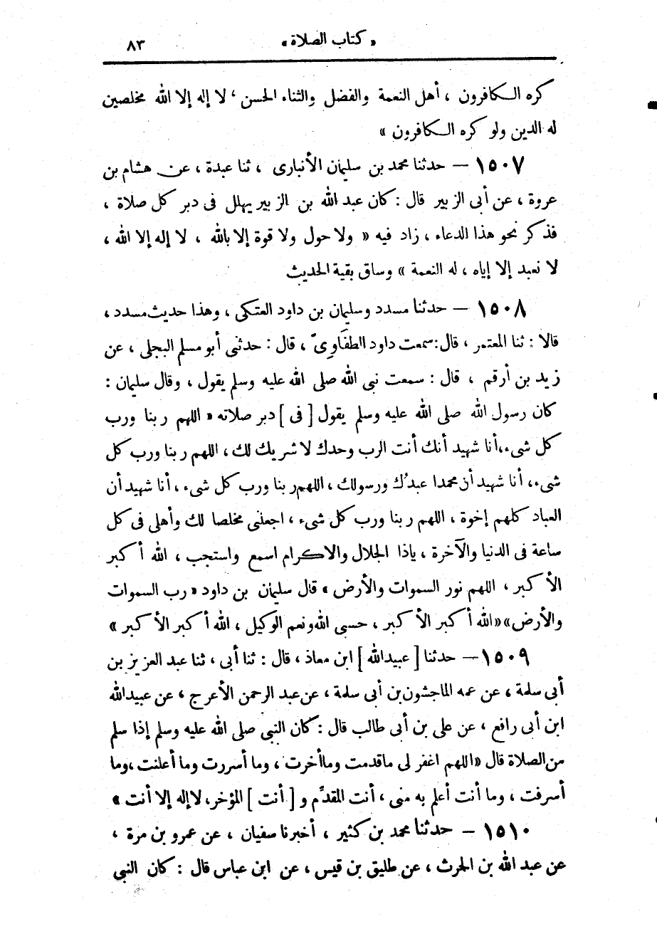 1508 - حَدَّثَنَا مُسَدَّدٌ، وَسُلَيْمَانُ بْنُ دَاوُدَ الْعَتَكِيُّ، وَهَذَا حَدِيثُ مُسَدَّدٍ، قَالَا: حَدَّثَنَا الْمُعْتَمِرُ، قَالَ: سَمِعْتُ دَاوُدَ الطُّفَاوِيَّ، قَالَ: حَدَّثَنِي أَبُو مُسْلِمٍ الْبَجَلِيُّ، عَنْ زَيْدِ بْنِ أَرْقَمَ، قَالَ: سَمِعْتُ نَبِيَّ الَّلهِ صَلَّى عَلَيْهِ وَسَلَّمَ يَقُولُ: - وَقَالَ سُلَيْمَانُ: كَانَ رَسُولُ الَّلهُ صَلَّى عَلَيْهِ وَسَلَّمَ يَقُولُ فِي دُبُرِ صَلَاتِهِ: - «§اللَّهُمَّ رَبَّنَا وَرَبَّ كُلِّ شَيْءٍ، أَنَا شَهِيدٌ أَنَّكَ أَنْتَ الرَّبُّ وَحْدَكَ لَا شَرِيكَ لَكَ، اللَّهُمَّ رَبَّنَا وَرَبَّ كُلِّ شَيْءٍ أَنَا شَهِيدٌ أَنَّ مُحَمَّدًا عَبْدُكَ وَرَسُولُكَ، اللَّهُمَّ رَبَّنَا وَرَبَّ كُلِّ شَيْءٍ، أَنَا شَهِيدٌ أَنَّ الْعِبَادَ كُلَّهُمْ إِخْوَةٌ، اللَّهُمَّ رَبَّنَا وَرَبَّ كُلِّ شَيْءٍ، اجْعَلْنِي مُخْلِصًا لَكَ وَأَهْلِي فِي كُلِّ سَاعَةٍ فِي الدُّنْيَا وَالْآخِرَةِ، يَا ذَا الْجَلَالِ وَالْإِكْرَامِ اسْمَعْ وَاسْتَجِبْ، اللَّهُ أَكْبَرُ الْأَكْبَرُ، اللَّهُمَّ نُورَ السَّمَوَاتِ وَالْأَرْضِ»، قَالَ سُلَيْمَانُ بْنُ دَاوُدَ: «رَبَّ السَّمَوَاتِ وَالْأَرْضِ، اللَّهُ أَكْبَرُ الْأَكْبَرُ، حَسْبِيَ اللَّهُ وَنِعْمَ الْوَكِيلُ، اللَّهُ أَكْبَرُ الْأَكْبَرُ»