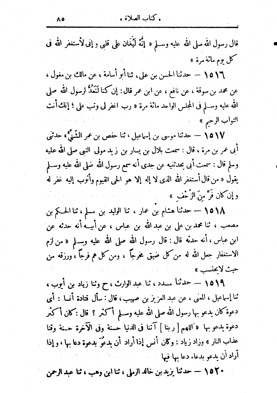 1516 - حَدَّثَنَا الْحَسَنُ بْنُ عَلِيٍّ، حَدَّثَنَا أَبُو أُسَامَةَ، عَنْ مَالِكِ بْنِ مِغْوَلٍ، عَنْ مُحَمَّدِ بْنِ سُوقَةَ، عَنْ نَافِعٍ، عَنِ ابْنِ عُمَرَ، قَالَ: إِنْ كُنَّا لَنَعُدُّ لِرَسُولِ اللَّهِ صَلَّى اللهُ عَلَيْهِ وَسَلَّمَ فِي الْمَجْلِسِ الْوَاحِدِ مِائَةَ مَرَّةٍ: «§رَبِّ اغْفِرْ لِي، وَتُبْ عَلَيَّ، إِنَّكَ أَنْتَ التَّوَّابُ الرَّحِيمُ»