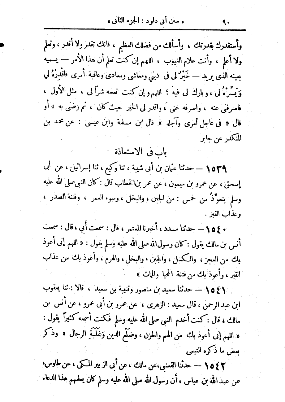 1540 - حَدَّثَنَا مُسَدَّدٌ، أَخْبَرَنَا الْمُعْتَمِرُ، قَالَ: سَمِعْتُ أَبِي، قَالَ: سَمِعْتُ أَنَسَ بْنَ مَالِكٍ، يَقُولُ: كَانَ رَسُولُ صَلَّى عَلَيْهِ وَسَلَّمَ يَقُولُ: «§اللَّهُمَّ إِنِّي أَعُوذُ بِكَ مِنَ الْعَجْزِ وَالْكَسَلِ، وَالْجُبْنِ وَالْبُخْلِ، وَالْهَرَمِ، وَأَعُوذُ بِكَ مِنْ عَذَابِ الْقَبْرِ، وَأَعُوذُ بِكَ مِنْ فِتْنَةِ الْمَحْيَا وَالْمَمَاتِ».