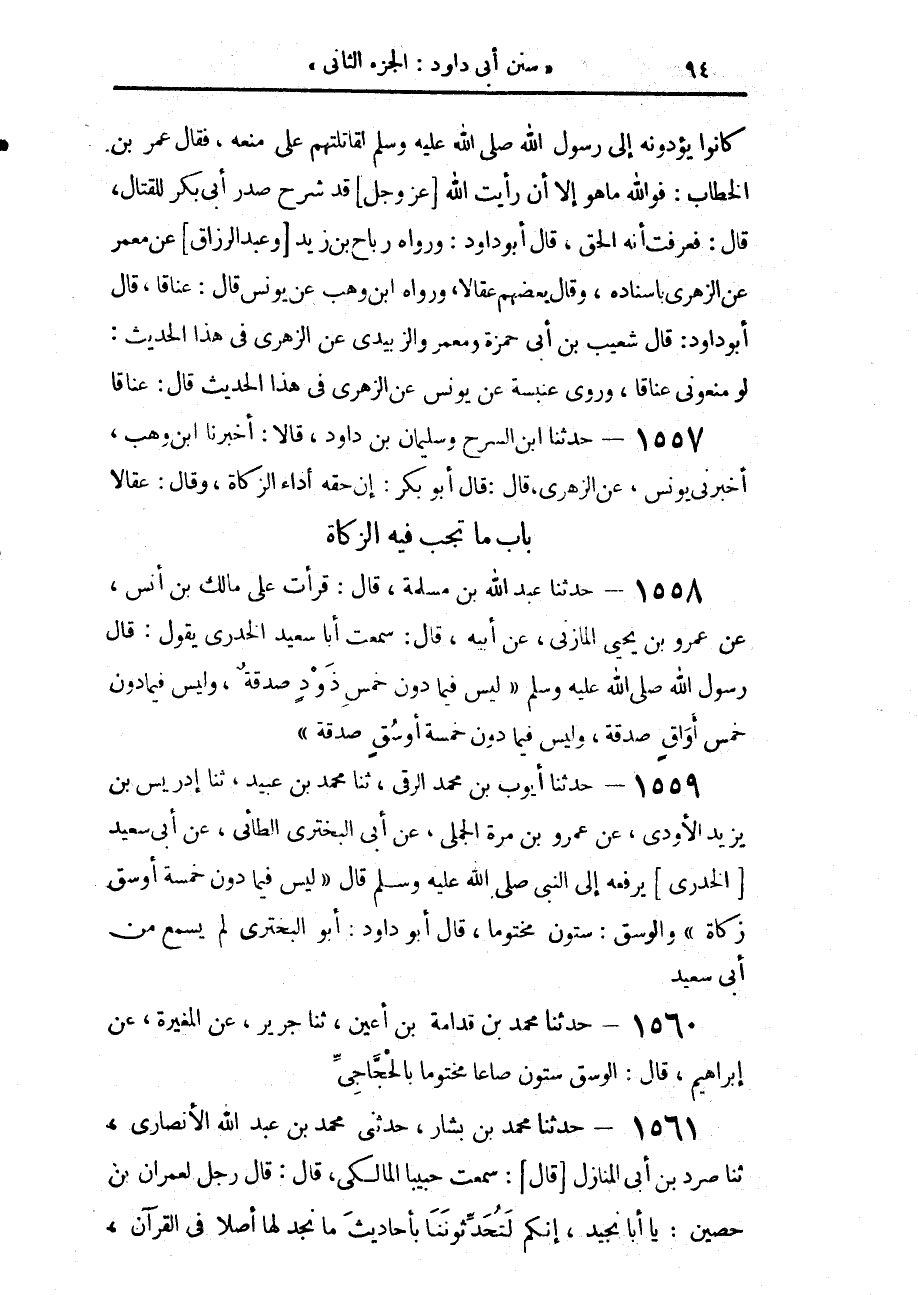 1558 - حَدَّثَنَا عَبْدُ اللَّهِ بْنُ مَسْلَمَةَ، قَالَ: قَرَأْتُ عَلَى مَالِكِ بْنِ أَنَسٍ، عَنْ عَمْرِو بْنِ يَحْيَى الْمَازِنِيِّ، عَنْ أَبِيهِ، قَالَ: سَمِعْتُ أَبَا سَعِيدٍ الْخُدْرِيَّ، يَقُولُ: قَالَ رَسُولُ اللَّهِ صَلَّى اللهُ عَلَيْهِ وَسَلَّمَ: «§لَيْسَ فِيمَا دُونَ خَمْسِ ذَوْدٍ صَدَقَةٌ، وَلَيْسَ فِيمَا دُونَ خَمْسِ أَوَاقٍ صَدَقَةٌ، وَلَيْسَ فِيمَا دُونَ خَمْسَةِ أَوْسُقٍ صَدَقَةٌ»