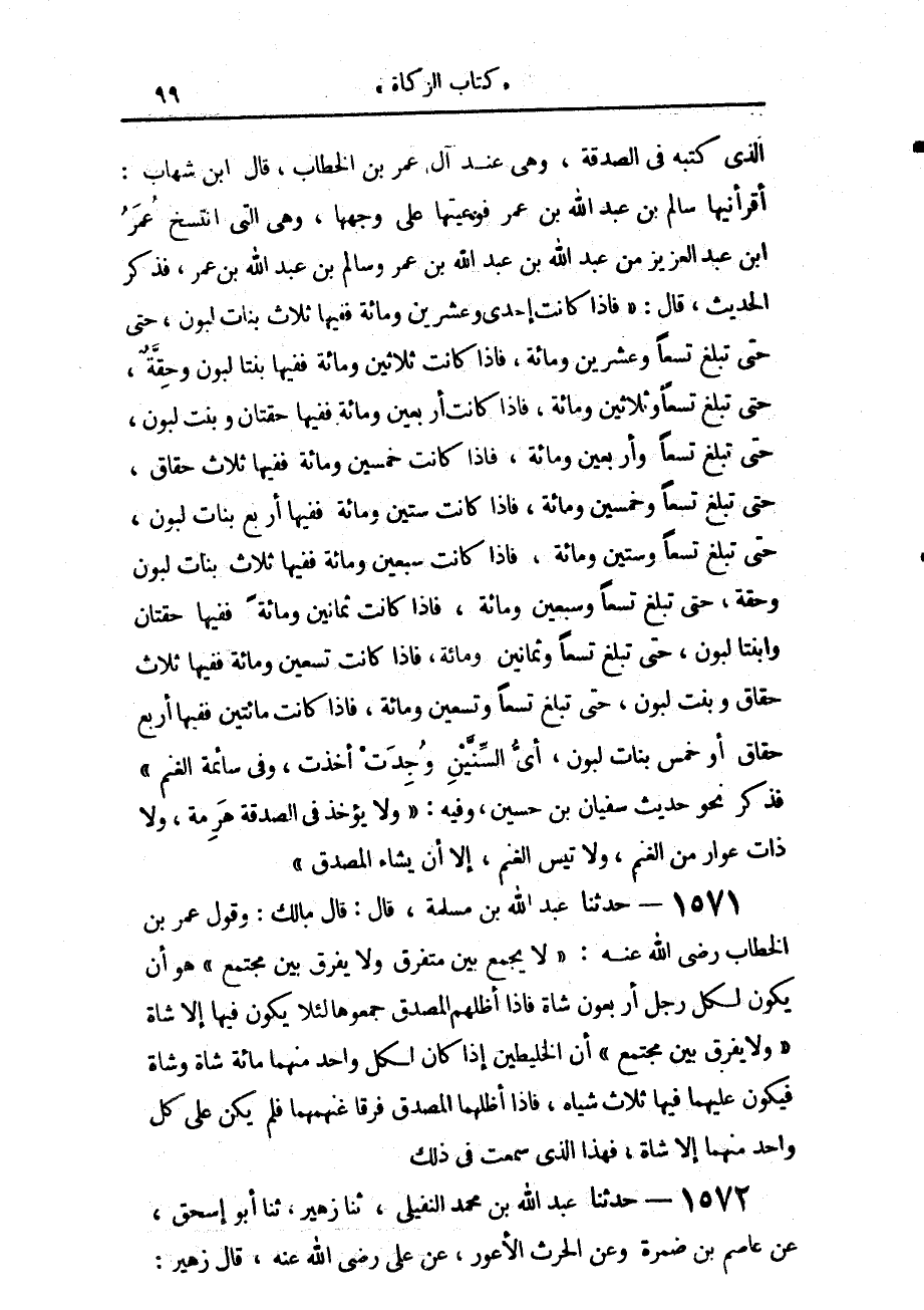 1572 - حَدَّثَنَا عَبْدُ اللَّهِ بْنُ مُحَمَّدٍ النُّفَيْلِيُّ، حَدَّثَنَا زُهَيْرٌ، حَدَّثَنَا أَبُو إِسْحَاقَ، عَنْ عَاصِمِ بْنِ ضَمْرَةَ، وَعَنِ الْحَارِثِ الْأَعْوَرِ، عَنْ عَلِيٍّ رَضِيَ اللَّهُ عَنْهُ، - قَالَ زُهَيْرٌ -[100]-: أَحْسَبُهُ عَنِ النَّبِيِّ صَلَّى اللهُ عَلَيْهِ وَسَلَّمَ - أَنَّه قَالَ: «§هَاتُوا رُبْعَ الْعُشُورِ، مِنْ كُلِّ أَرْبَعِينَ دِرْهَمًا دِرْهَمٌ، وَلَيْسَ عَلَيْكُمْ شَيْءٌ حَتَّى تَتِمَّ مِائَتَيْ دِرْهَمٍ، فَإِذَا كَانَتْ مِائَتَيْ دِرْهَمٍ، فَفِيهَا خَمْسَةُ دَرَاهِمَ، فَمَا زَادَ فَعَلَى حِسَابِ ذَلِكَ، وَفِي الْغَنَمِ فِي أَرْبَعِينَ شَاةً شَاةٌ، فَإِنْ لَمْ يَكُنْ إِلَّا تِسْعٌ وَثَلَاثُونَ، فَلَيْسَ عَلَيْكَ فِيهَا شَيْءٌ»، - وَسَاقَ صَدَقَةَ الْغَنَمِ مِثْلَ الزُّهْرِيِّ - قَالَ: «وَفِي الْبَقَرِ فِي كُلِّ ثَلَاثِينَ تَبِيعٌ، وَفِي الْأَرْبَعِينَ مُسِنَّةٌ، وَلَيْسَ عَلَى الْعَوَامِلِ شَيْءٌ» - وَفِي الْإِبِلِ فَذَكَرَ صَدَقَتَهَا كَمَا ذَكَرَ الزُّهْرِيُّ - قَالَ: «وَفِي خَمْسٍ وَعِشْرِينَ خَمْسَةٌ مِنَ الْغَنَمِ، فَإِذَا زَادَتْ وَاحِدَةً فَفِيهَا ابْنَةُ مَخَاضٍ، فَإِنْ لَمْ تَكُنْ بِنْتُ مَخَاضٍ، فَابْنُ لَبُونٍ ذَكَرٌ إِلَى خَمْسٍ وَثَلَاثِينَ، فَإِذَا زَادَتْ وَاحِدَةً، فَفِيهَا بِنْتُ لَبُونٍ إِلَى خَمْسٍ وَأَرْبَعِينَ، فَإِذَا زَادَتْ وَاحِدَةً، فَفِيهَا حِقَّةٌ طَرُوقَةُ الْجَمَلِ إِلَى سِتِّينَ» - ثُمَّ سَاقَ مِثْلَ حَدِيثِ الزُّهْرِيِّ - قَالَ: «فَإِذَا زَادَتْ وَاحِدَةً يَعْنِي وَاحِدَةً وَتِسْعِينَ، فَفِيهَا حِقَّتَانِ طَرُوقَتَا الْجَمَلِ إِلَى عِشْرِينَ وَمِائَةٍ، فَإِنْ كَانَتِ الْإِبِلُ أَكْثَرُ مِنْ ذَلِكَ، فَفِي كُلِّ خَمْسِينَ حِقَّةٌ، وَلَا يُفَرَّقُ بَيْنَ مُجْتَمِعٍ، وَلَا يُجْمَعُ بَيْنَ مُفْتَرِقٍ خَشْيَةَ الصَّدَقَةِ، وَلَا تُؤْخَذُ فِي الصَّدَقَةِ هَرِمَةٌ، وَلَا ذَاتُ عَوَارٍ، وَلَا تَيْسٌ، إِلَّا أَنْ يَشَاءَ الْمُصَدِّقُ، وَفِي النَّبَاتِ مَا سَقَتْهُ الْأَنْهَارُ، أَوْ سَقَتِ السَّمَاءُ الْعُشْرُ، وَمَا سَقَى الْغَرْبُ فَفِيهِ نِصْفُ الْعُشْرِ»، وَفِي حَدِيثِ عَاصِمٍ، وَالْحَارِثِ: «الصَّدَقَةُ فِي كُلِّ عَامٍ»، قَالَ زُهَيْرٌ: أَحْسَبُهُ قَالَ مَرَّةً، وَفِي حَدِيثِ عَاصِمٍ: إِذَا لَمْ يَكُنْ فِي الْإِبِلِ ابْنَةُ مَخَاضٍ، وَلَا ابْنُ لَبُونٍ، فَعَشَرَةُ دَرَاهِمَ أَوْ شَاتَانِ.