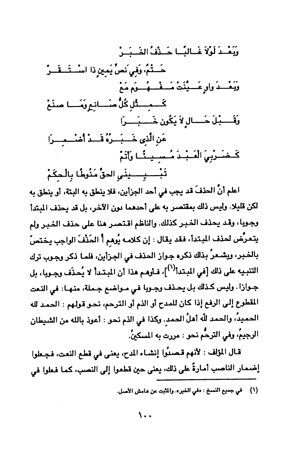 اعلم أنّ الحذفَ قد يجب في أحد الجزأين، فلا ينطق به البتة، أو ينطق به لكن قليلا. وليس ذلك بمقتصر به على أحدهما دون الآخر، بل قد يحذف المبتدأ وجوبا، وقد يحذف الخبر كذلك. والناظم اقتصر هنا على حذف الخبر ولم يتعرّض لحذف المبتدأ، فقد يقال: إن كلامه يُوهِم أالحَذْفَ الواجب يختصّ بالخبر، ويشعرُ بذلك ذكره جواز الحذف في الجزأين، فلما ذكر وجوب ترك التنبيه على ذلك [في المبتدأ]، فأوهم هذا أن المبتدأَ لا يُحذَف وجوبا، بل جوازا. وليس كذلك بل يحذف وجوبا في مواضع جملة، منها: في النعت المقطوع إلى الربع إذا كان للمدح أو الذم أو الترحم، نحو قولهم: الحمد لله الحميدُ، والحمد لله أهلُ الحمدِ. وكذا في الذم نحو: أعوذ بالله من الشيطان الرجيمُ، وفي الترحُّم نحو: مررت به المسكينُ.