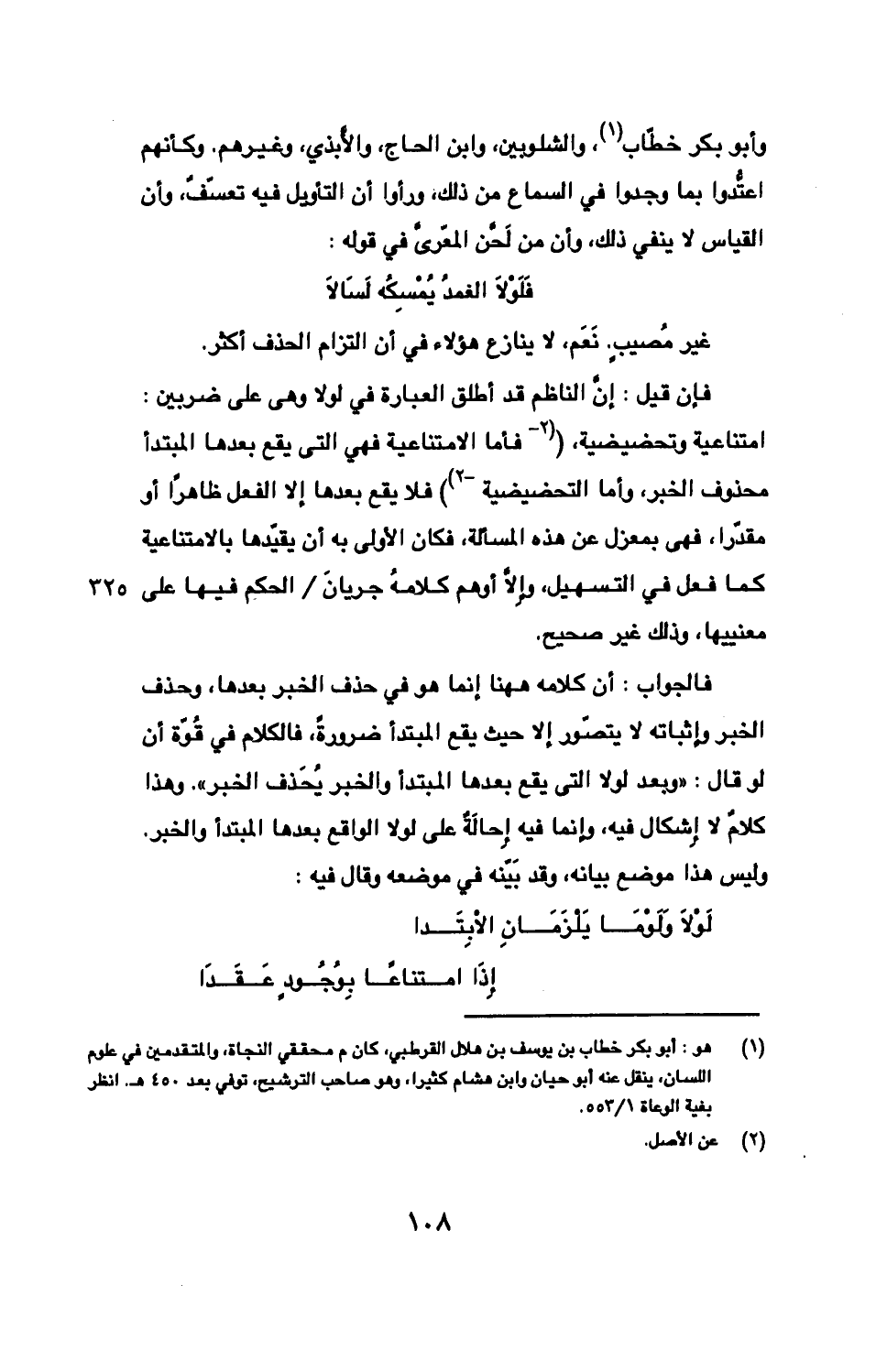 فالجواب: أن كلامه ههنا إنما هو في حذف الخبر بعدها، وحذف الخبر وإثباته لا يتصوّر إلا حيث يقع المبتدأ ضرورةً، فالكلام في قُوّة أن لو قال: «وبعد لولا التى يقع بعدها المبتدأ والخبر يُحذَف الخبر». وهذا كلامق لا إِشكال فيه، وإنما فيه إِحالةٌ على لولا الواقع بعدها المبتدأ والخبر. وليس هذا موضع بيانه، وقد بَيّنه في موضعه وقال فيه: