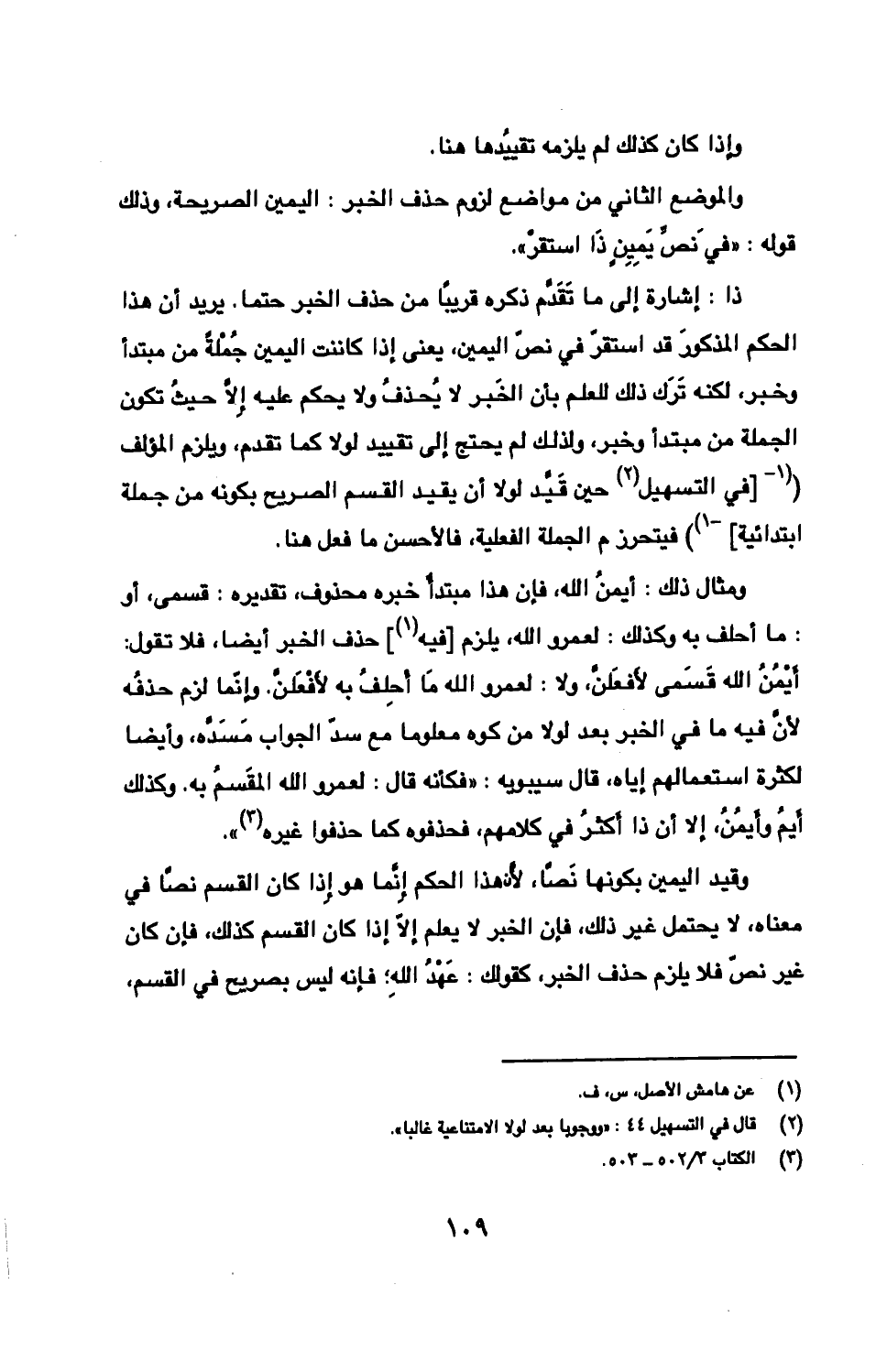 وقيد اليمين بكونها نَصّا، لن هذا الحكم إِنما هو إِذا كان القسم نصّا في معناه، لا يحتمل غير ذلك، فإن الخبر لا يعلم إلّا إذا كان القسم كذلك، فإن كان غير نصّ فلا يلزم حذف الخبر، كقولك: عَهْدُ اللهِ؛ فإنه ليس بصريح في القسم