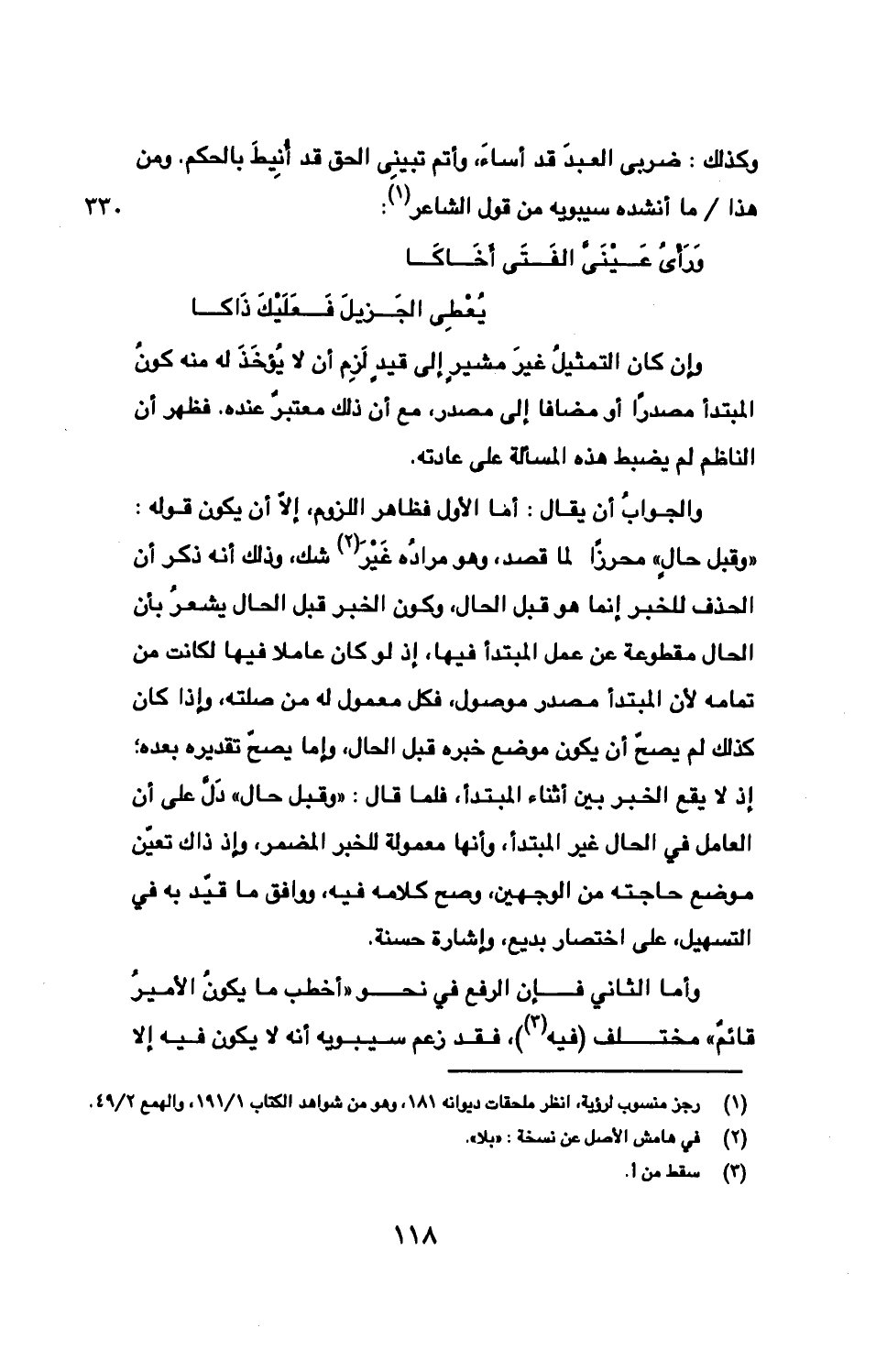 والجوابُ أن يقال: أما الأول فظاهر اللزوم، إلا أن يكون قوله: «وقبل حالٍ» محرزًا لما قصد، وهو مرادُه غَيْرَ شك، وذلك أنه ذكر أن الحذف للخبر إنما هو قبل الحال، وكون الخبر قبل الحال يشعرُ بأن لاحال مقطوعة عن عمل المبتدأ فيها، إذ لو كان عاملا فيها لكانت من تمامه لأن المبتدأ مصدر موصول، فكل معموله له من صلته، وإذا كان كذلك لم يصحّ أن يكون موضع خبره قبل الحال، وإما يصحّ تقديره بعده؛ إذ لا يقع الخبر بين أثناء المبتدأ، فلما قال: «وقبل حال» دَلّ على أن العامل في الحال غير المبتدأ، وأنها معمولة للخبر المضمر، وإذ ذاك تعيّن موضع حاجته من الوجهين، وصح كلامه فيه، ووافق ما قيّد به في التسهيل، على اختصار بديع، وإشارة حسنة.