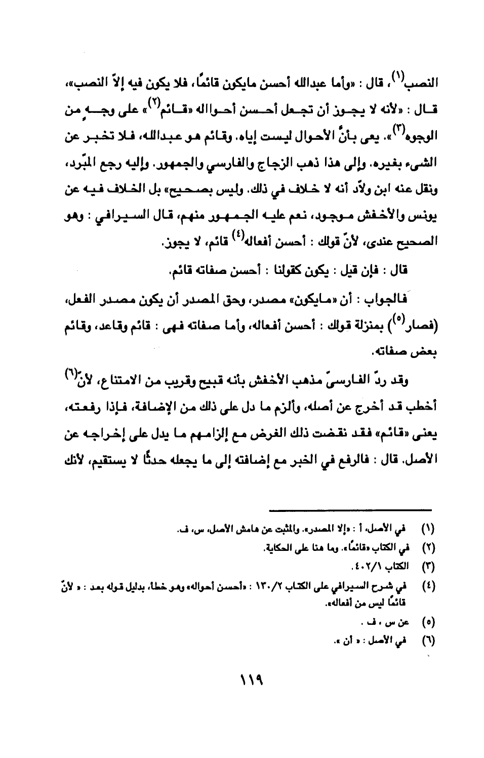 النصب، قال: «وأما عبد الله أحسن ما يكون قائمًا، فلا يكون فيه إلّا النصب»، قال: «لأنه لا يجوز أن تجعل أحسن أحواله «قائم» على وجهٍ من الوجوه». يعى بأنّ الأحوال ليست إياه. وقائم هو عبد الله، فلا تخبر عن الشئ بغيره. وإلى هذا ذهب الزجاج والفارسي والجمهور. وإليه رجع المبد، ونقع عنه ابن ولّاد أنه لا خلاف في ذلك. وليس بصحيح». بل الخلاف فيه عن يونس والأخفش موجود، نعم عليه الجمهو منهم، قال السيرافي: وهو الصحيح عندى، لأنّ قولك: أحسن أفعاله قائم، لا يجوز.