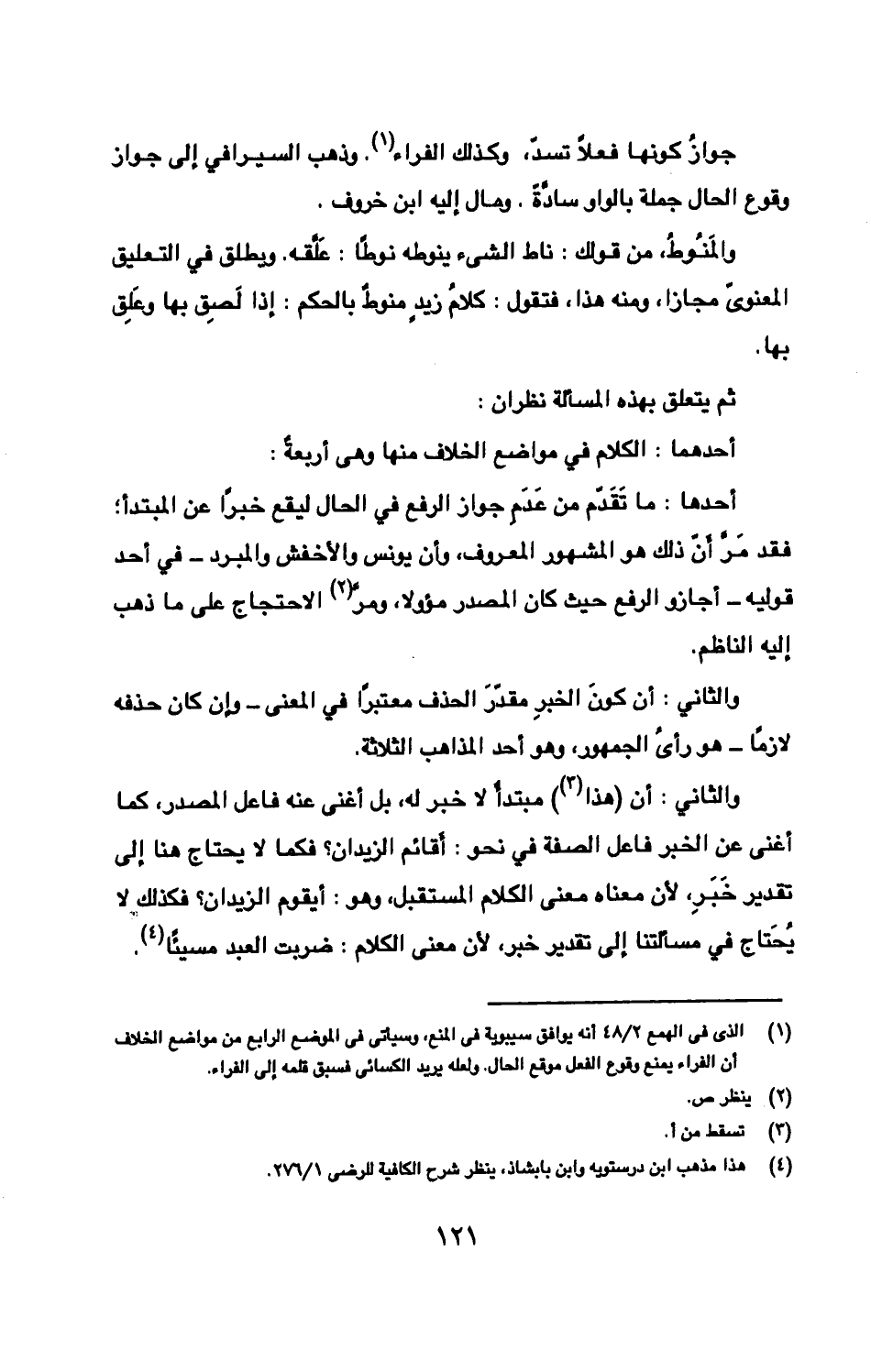 أحدها: ما تَقَدّم من عَدَمِ جواز الرفع في الحال ليقع خبرًا عن المبتدأ؛ فقد مَرّ أَنّ ذلك هو المشهور المعروف، وأن يونس والأخفش والمبرد -في أحد قوليه- أجازو الرفع حيث كان المصدر مؤولا، ومرّ الاحتجاج على ما ذهب إليه الناظم.