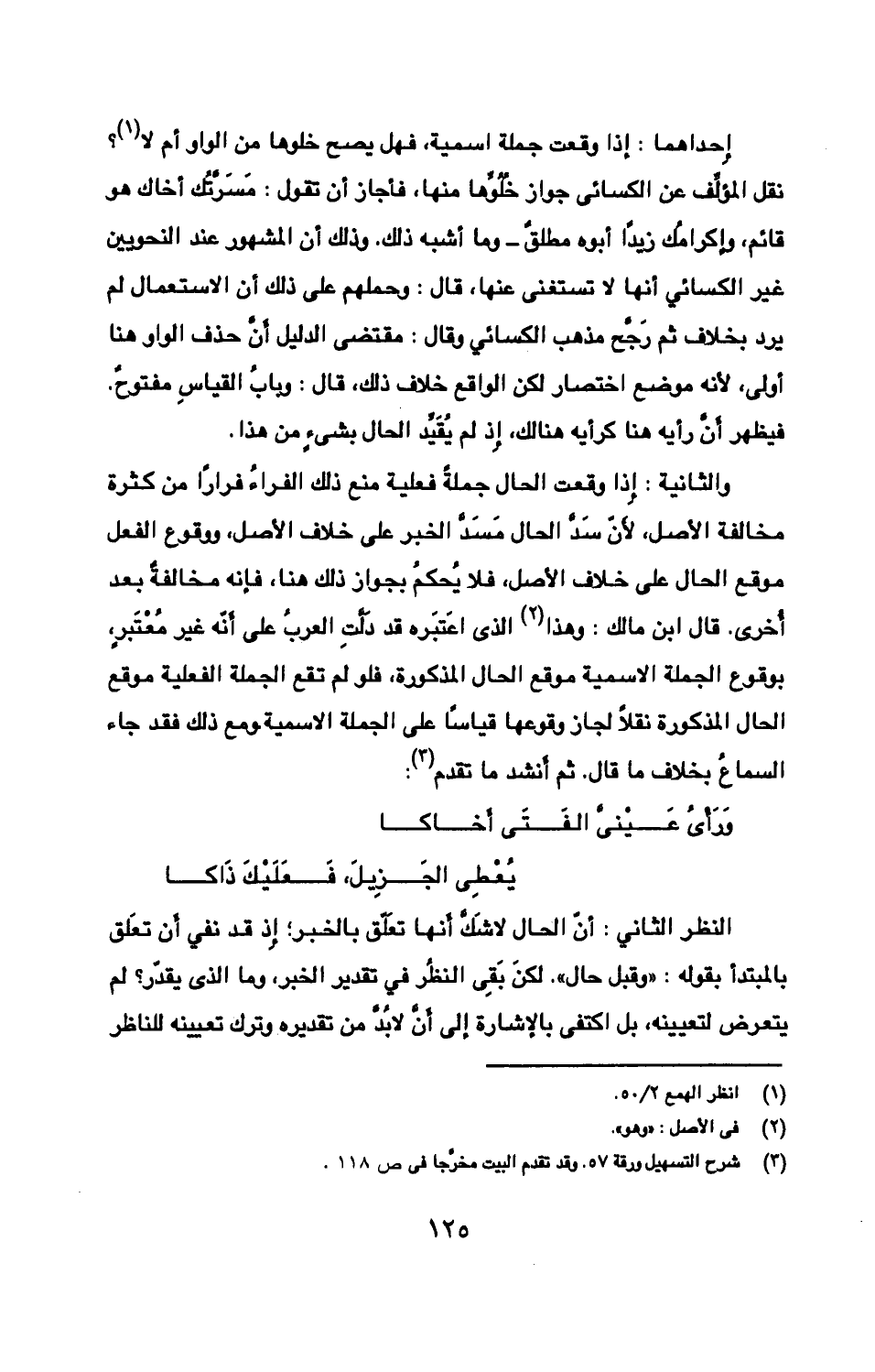 والثانية: إِذا وقعت الحال جملةً فعلية منع ذلك الفراءُ فرارًا من كثرة مخالفة الأصل، لأَنّ سَدّ الحال مَسَدّ الخبر على خلاف الأصل، ووقع الفعل موقع الحال على خلاف الأصل، فلا يُحكمُ بجواز ذلك هنا، فإنه مخالفةٌ بعد أخرى. قال ابن مالك: وهذا الذى اعتَبَره قد دَلّتِ عليه العربُ على أنّه غير مُعْتَبرٍ، بوقوع الجملة الاسمية موقع الحال المذكورة، فلو لم تقع الجملة الفعلية موقع الحال المذكورة نقلًا لجاز وقوعها قياسًا على الجملة الاسمية ومع ذلك فقد جاء السماعُ بخلاف ما قال. ثم أَنشد ما تقدم: