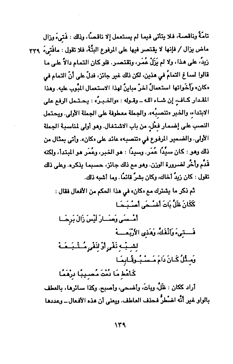تامّة وناقصة، فلا يتأتى فيما لم يستعمل إلا ناقصًا، وذلك: فَتِئَ وزال ماض يزال / فإنها لا يقتصر فيها على المرفوق البتّةَ، فلا تقول: ما فَتِئَ زيدٌ، على هذا، ولا لم يَزَلْ عُمَر، وتقتصر. فلو كان التمام دالًا على ما قالوا لساغ التمامُ في هذين، لكن ذلك غير جائز، فدلّ على أَنّ التمام في «كان» وَأخَواتها استعمالٌ آخرْ مباينٌ لهذا الاستعمال المبوب عليه. وهذا المقدار كافٍ، إن شاء الله- وقوله: «والخبرٌ»: يحتمل الرفع على الابتداءش، والخبر «تنصِبُه». والجملة معطوفة على الجملة الأولى. ويحتمل النصب على إضمار فِعْلٍ، من باب الاشتغال. وهو أولى لمناسبة الجملة الأولى. والضمير المرفوع في «تنصبه» عائد على «كان». وأتى بمثال من ذلك وهو: كان سيِّدًا عُمَر. وسيدًا: هو الخبر، وعُمَر هو المبتدأ، ولكنه قَدّم وأَخّر لضرورة الوزن. وهو مع ذلك جائز، حسبما يذكره. وعلى ذلك تقول: كان زيدٌ أخاك، وكان بشرٌ قائمًا. وما أشبه ذلك.