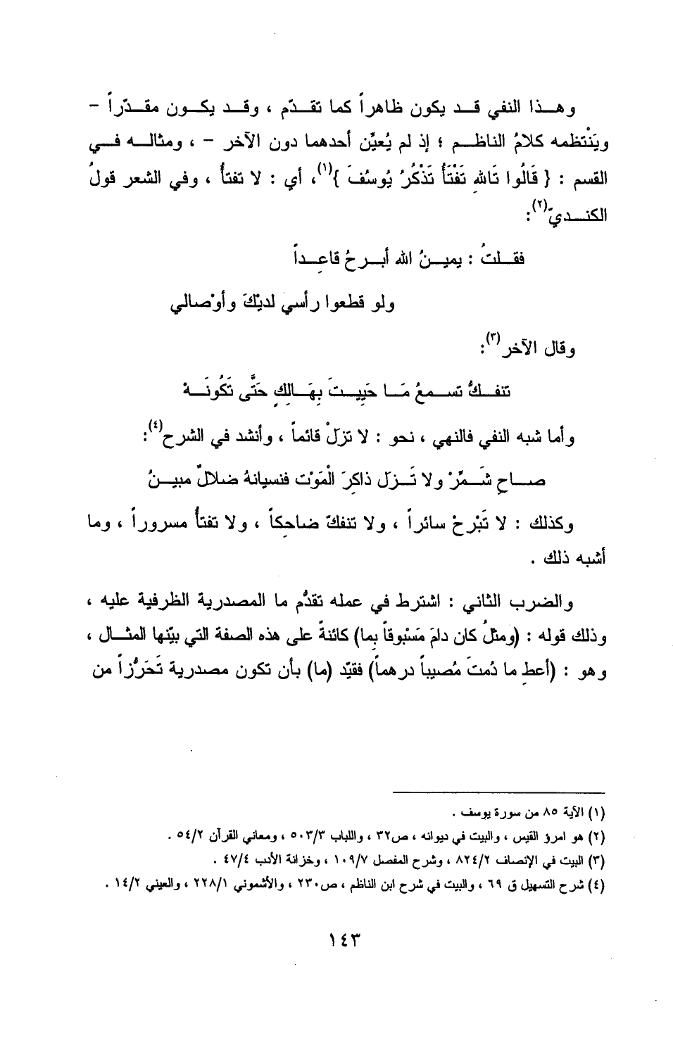 وهذا النفي قد يكون ظاهرًا كما تقدّم، وقد يكون مقدّرًا -ويَنْتظمه كلامُ الناظم؛ إذ لم يُعيِّن أحدهم دون الآخر-، ومثاله في القسم: {قَالُوا تَاللهِ تَفْتَأُ تَذْكُرُ يُوسُفَ}، أي: لا تفتأُ، وفي الشعر قولُ الكنديّ: