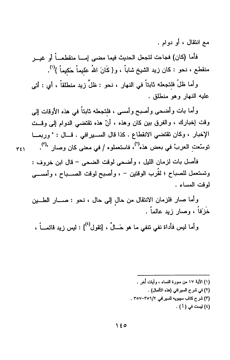 وأما بات وأضحى وأصبح وأمسى، فلتجعله ثابتًا في هذه الأوقات إلى وقت إخبارك، والفرق بين كان وهذه، أنّ هذه تقتضي الدوام إلى وقت الإخبار، وكان تقتضي الانقطاع. كذا قال السيرافي. قال: «وربما توسّعتِ العربُ في بعض هذه، فاستعملوه/ في معنى كان وصار».