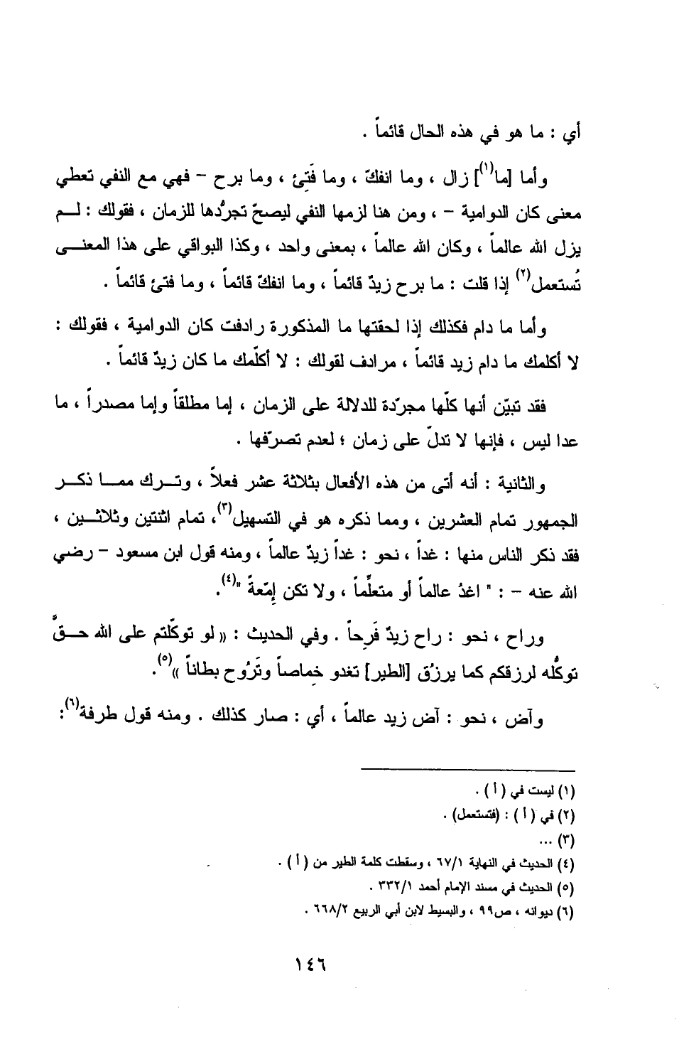 وأما [ما] زال، وما انفكّ، وما فَتِئ، وما برح -فهي مع النفي تعطي معنى كان الدوامية-، ومن هنا لزمها النفي ليصحّ تجرُّدها للزمان، فقولك: لم يزل الله عالمًا، وكان الله عالمًا، بمعنى واحد، وكذا البواقي على هذا المعنى تُستعمل إذا قلت: ما برح زيدٌ قائمًا، وما انفكّ قائمًا، وما فتئ قائمًا.