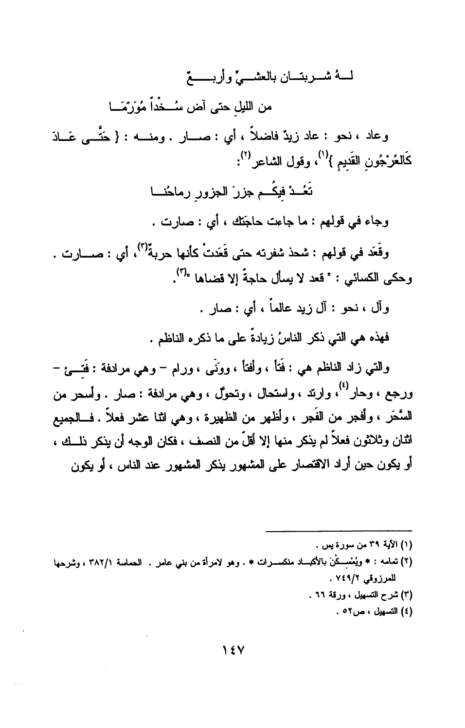 وعاد، نحو: عاد زيدٌ فاضلًا، أي: صار. ومنه: {حَتّى عَادَ كَالعُرْجُونِ القَدِيمِ}، وقول الشاعر: