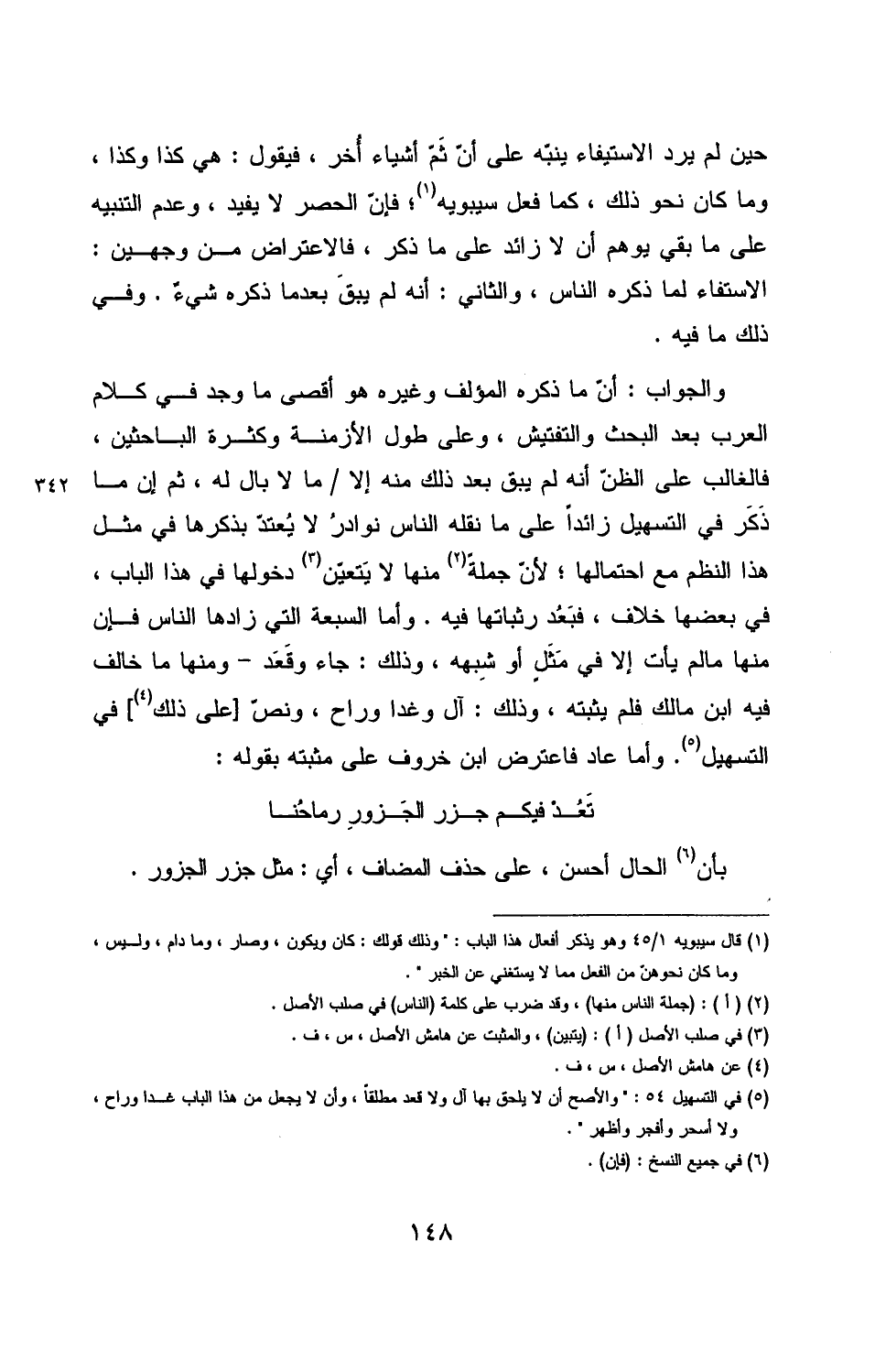 حين لم يرد الاستيفاء ينبّه على أنّ ثَمّ أشياء أُخر، فيقول: هي كذا وكذا، وما كان نحو ذلك، كما فعل سيبويه؛ فإنّ الحصر لا يفيد، وعدم التنبيه على ما بقي يوهم أن لا زائد على ما ذكر، فالاعتراض من وجهين: الاستفاء لما ذكره الناس، والثاني: أنه لم يبقَ بعدما ذكره شيءٌ. وفي ذلك ما فيه.