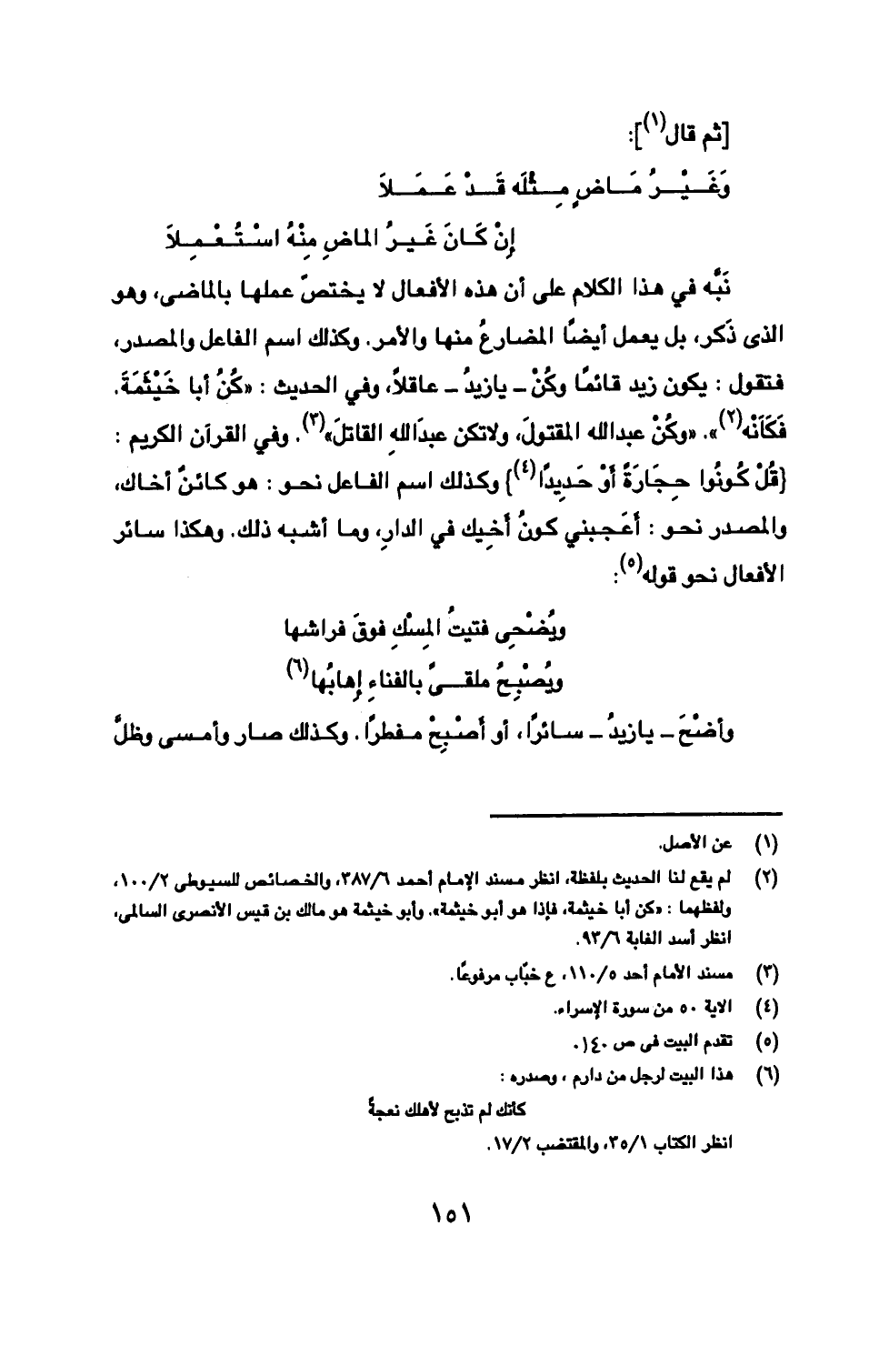 نَبَّه في هذا الكلام على أن هذه الأفعال لا يختصً عملها بالماضى، وهو الذى ذّكر، بل يعمل أيضًا المضارعُ منها والآمر. وكذلك اسم الفاعل والمصدر، فتقول: يكون زيد قائمًا وكُنْ -يا زيدُ- عاقلًا، وفي الحديث: «كُن أبا خَيْثَمَةَ. فَكَانه». «وكُنْ عبد الله المقتولَ، ولا تكون عبدَ اللهِ القاتلَ». وفي القرآن الكريم: {قُلْ كُونُوا حِجَارَةً أَوْ حَدِيدًا} وكذلك اسم الفاعل نحو: هو كائنٌ أخاك، والمصدر نحو: أَعجبني كونُ أَخِيك في الدار، وما أشبه ذلك. وهكذا سائر الأفعال نحو قوله: