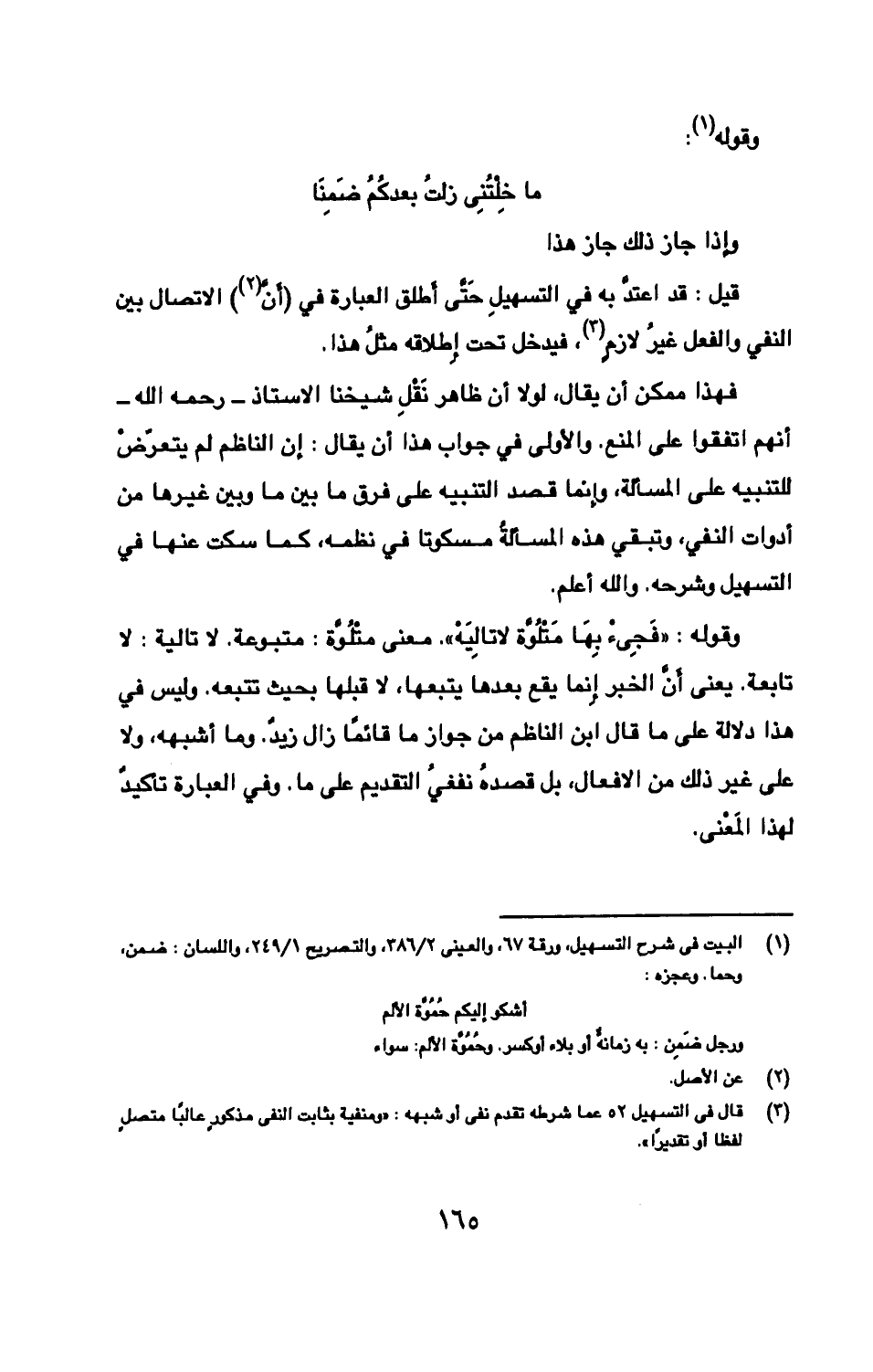 فهذا ممكن أن يقال، لولا أن ظاهر نَقْلِ شيخنا الاستاذ -رحمه الله- أنهم اتفقوا على المنع. والأولى في جواب هذا أن يقال: إن الناظم لم يتعرّضْ للتنبيه على المسألة، وإنما قصد التنبيه على فرق ما بين ما وبين غيرها من أدوات النفي، وتبقي هذه المسألةُ مسكوتا في نظمه، كما سكت عنها في التسهيل وشرحه. والله أعلم.