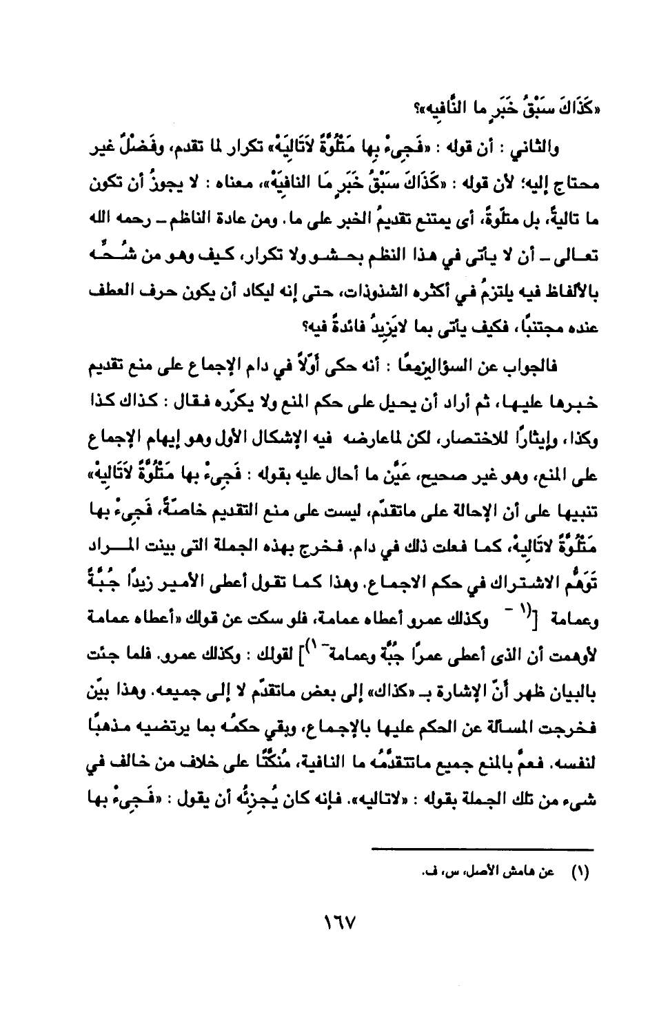 فالجواب عن السؤالين معًا: أنه حكى أَوّلًا في دام الإجماع على منع تقديم خبرها عليها، ثم أراد أن يحيل على حكم المنع ولا يكرّره فقال: كذاك كذا وكذا، وإيثارًا للاختصار، لكن لما عارضه فيه الإشكال الأول وهو إيهام الإجماع على المنع، وهو غير صحيح، عَيّن ما أحال عليه بقوله: فَجِئْ بِها مَتْلُوّةً لاَ تَالِيَهْ» تنبيها على أن الإجالة على ما تقدّم، ليست على منع التقديم خاصّةً، فَجِئْ بها مَتْلُوّةً لاَ تَالِيَهْ، كما فعلت ذلك في دام. فخرج بهذه الجملة التى بينت المراد تَوَهُّم الاشتراك في حكم الاجماع. وهذا كما تقول أعطى الأمير زيدًا جُبّةً وعمامة [وكذلك عمرو أعطاه عمامة، فلو سكت عن قولك «أعطاه عمامة لأوهمت أن الذى أعطى عمرًا جُبّة وعمامة] لقولك: وكذلك عمرو. فلما جئت بالبيان ظهر أَنّ الإشارة بـ «كذاك» إلى بعض ما تقدّم لا إلى جميعه. وهذا بيّن فخرجت المسألة عن الحكم عليها بالإجماع، وبقي حكمُه بما يرتضيه مذهبًا لنفسه. فعمّ بالمنع جميع ما تتقدّمُه ما النافية، مُنكّتًا على خلاف من خالف في شئ من تلك الجملة بقوله: «لا تاليه». فإنه كان يُجزِئُه أن يقول: «فَجِئْ بِها
