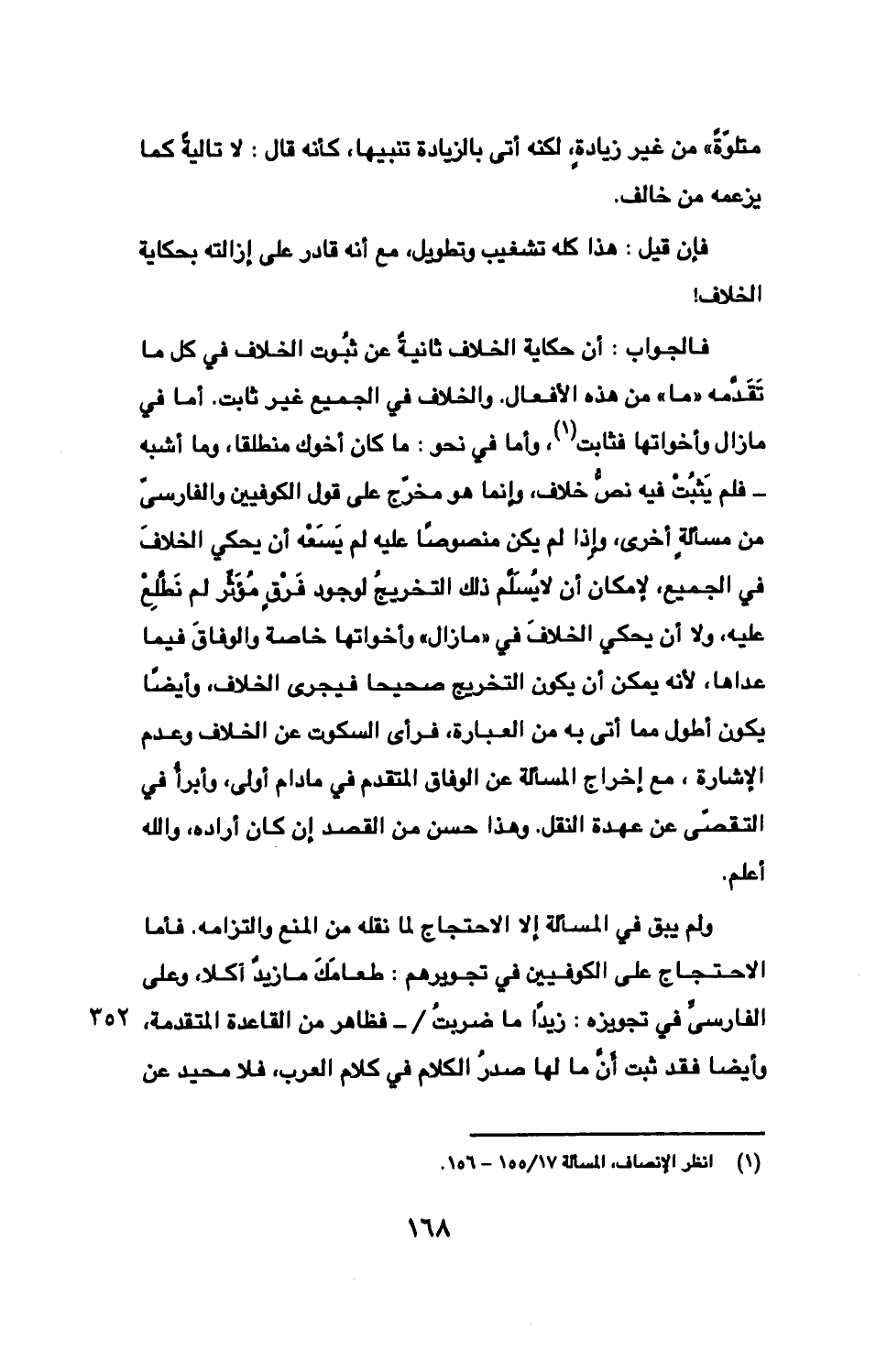 فالجواب: أن حكاية الخلاف ثانيةٌ عن ثُبوت الخلاف في كل ما تَقَدّمه «ما» من هذه الأفعال. والخلاف في الجميع غير ثابت. أما في مازال وأخواتها فثابت، وأما في نحو: ما كان أخوك منطلقا، وما اشبه -فلم يَثبُتْ فيه نصُّ خلاف، وإنما هو مخرّج على قول الكوفيين والفارسىّ من مسألةٍ أخرى، وإِذا لم يكن منصوصًا عليه لم يَسَعْه أن يحكي الخلافَ في الجميع، لإمكان أن لا يُسَلّم ذلك التخريجُ لوجود فَرْقٍ مُؤَثّر لم نَطلِعْ عليه، ولا أن يحكي الخلافَ في «ما زال» وأخواتها خاصة والوفاقَ فيما عداها، لأنه يمكن أن يكون التخريج صحيحا فيجرى الخلاف، وأيضًا يكون أطول مما أتى به من العبارة، فرأى السكوت عن الخلاف وعدم الإشارة، مع إخراج المسألة عن الوفاق المتقدم في ما دام أولى، وأبرأُ في التقصّى عن عهدة النقل. وهذا حسن من القصد إن كان أراده، والله أعلم.