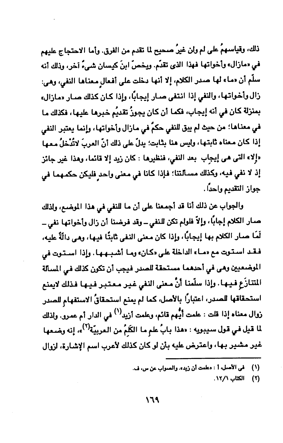 والجواب عن ذلك أنا قد أجمعنا على أن ما للنفي في هذا الموضع، ولذلك صار الكلام إجابًا، وإلّا فلو لم تكن للنفي -وقد فرضنا أن زال وأخواتها نفي- لَمَا صار الكلام بها إيجابًا، وإذا كان معنى النفي ثابتًا فيها، وهى دالّة عليه، فقد استوت مع «ما» الداخلة على «كان» وما أشبهها. وإذا استوت في الموضعيين وهى في أحدهما مستحقة للصدر فيجب أن تكون كذلك في المسألة المتنازَعِ فيها. وإذا سلّمنا أَنّ معنى النفي غير معتبر فيها فذلك لا يمنع استحقاقها للصدر، اعتبارًا بالأصل، كما لم يمنع استحقاقُ الاستفهامِ للصدر زوال معناه إذا قلت: علمت أَيُّهم قائم، وعلمت أزيد في الدار أم عمرو. ولذلك لما قيل في قول سيبويه: «هذا بابُ علمِ ما الكَلِمُ من العربية»، إنه وضعها غير مشير بها، واعترض عليه بأن لو كان كذلك لأعرب اسم الإشارة، لزوال