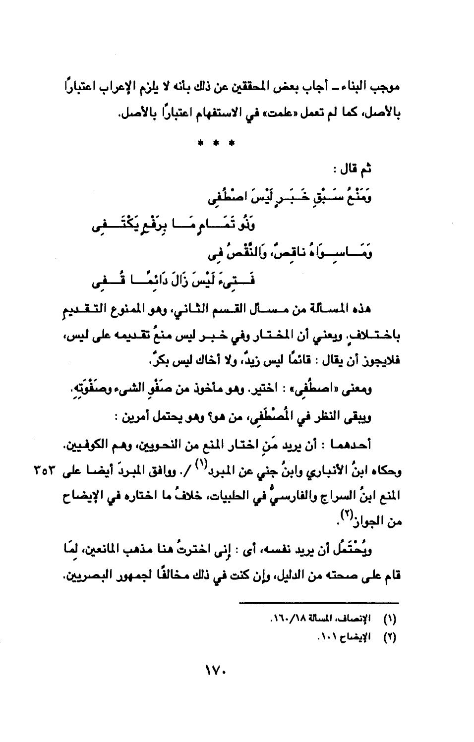 ويُحْتَمُل أن يريد نفسه، أى: إِنى اخترتُ هنا مذهب المانعين، لِمَا قام على صحته من الدليل، وإن كنت في ذلك مخالفًا لجمهور البصريين.