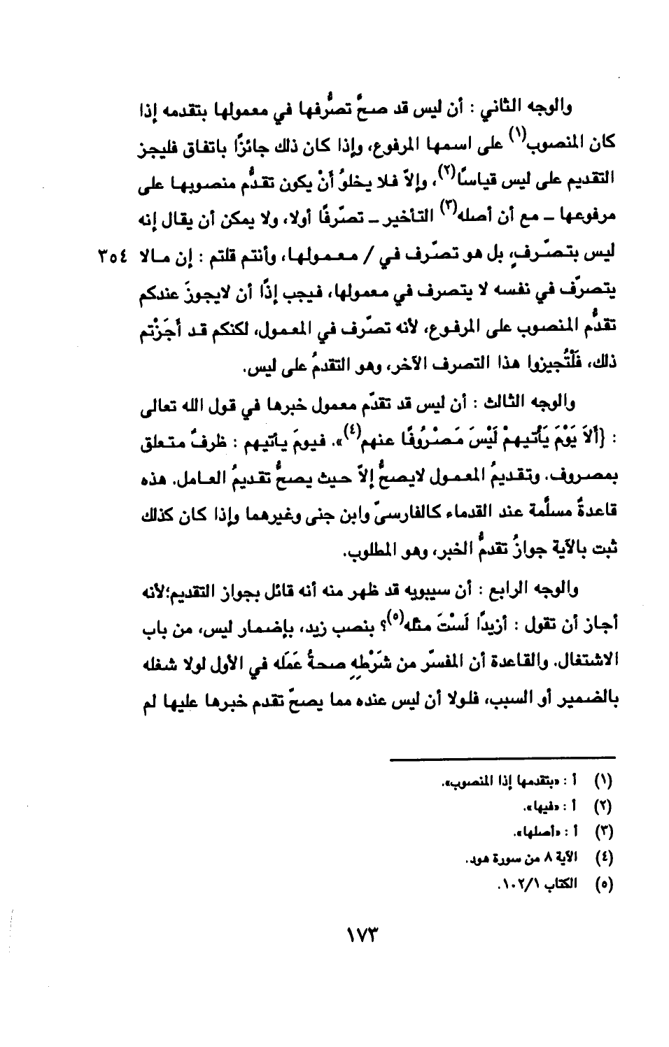 والوجه الثالث: أن ليس قد تقدّم معمول خبرها في قول الله تعالى: {ألَا يَوْمَ يَأتيهمْ لَيْسَ مَصْرُوفًا عنهم}. فيومَ يأتيهم: ظرفٌ متعلق بمصروف. وتقديمُ المعمول لا يصحُّ إلّا حيث يصحُّ تقديمُ العامل. هذه قاعدةٌ مسلّمة عند القدماء كالفارسىّ وابن جنى وغيرهما وإذا كان كذلك ثبت بالآية جوازُ تقدُّم الخبر، وهو المطلوب.