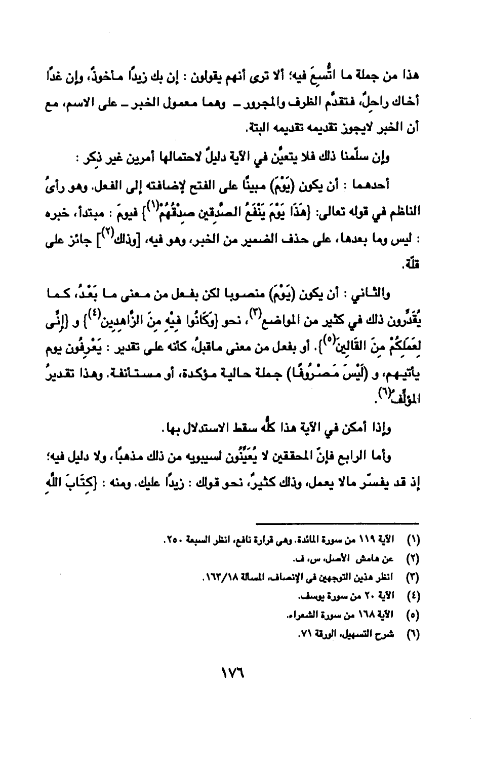 أحدهما: أن يكون (يَوْمَ) مبينًا على الفتح لإضافته إلى الفعل. وهو رأىُ الناظم في قوله تعالى: {هَذَا يَوْمَ يَنْفَعُ الصّادِقين صِدْقُهُمْ} فيومَ: مبتدأ، خبره: ليس وما بعدها، على حذف الضمير من الخبر، وهو فيه، [وذلك] جائز على قلّة.