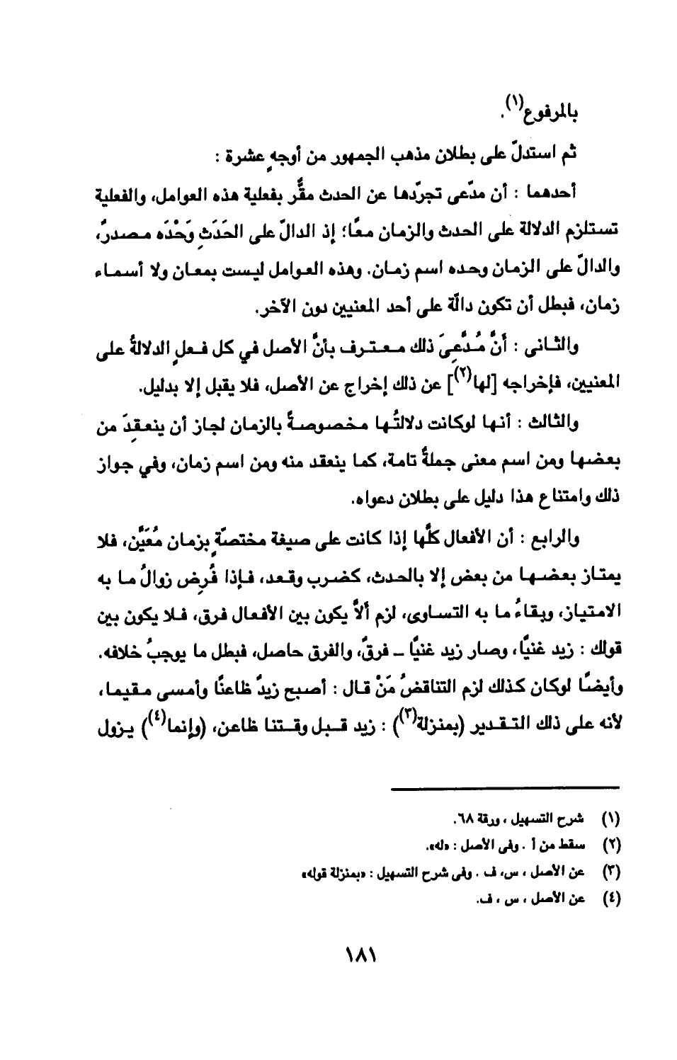 والرابع: أن الأفعال كلّها إذا كانت على صيغة مختصّةٍ بزمان مُعَيّن، فلا يمتاز بعضها من بعض إلا بالحدث، كضرب وقعد، فإذا فُرِض زوالُ ما به الامتياز، وبقاءُ ما به التساوى، لزم أَلّا يكون بين الأفعال فرق، فلا يكون بين قولك: زيد غنيًا، وصار زيد غنيًا -فرقُ، والفرق حاصل، فبطل ما يوجبُ خلافه. وأيضًا لو كان كذلك لزم التناقضُ مَنْ قال: أصبح زيدٌ ظاعنًا وأمسى مقيما، لأنه على ذلك التقدير (بمنزلة): زيد قبل وقتنا ظاعن، (وإنما) يزول