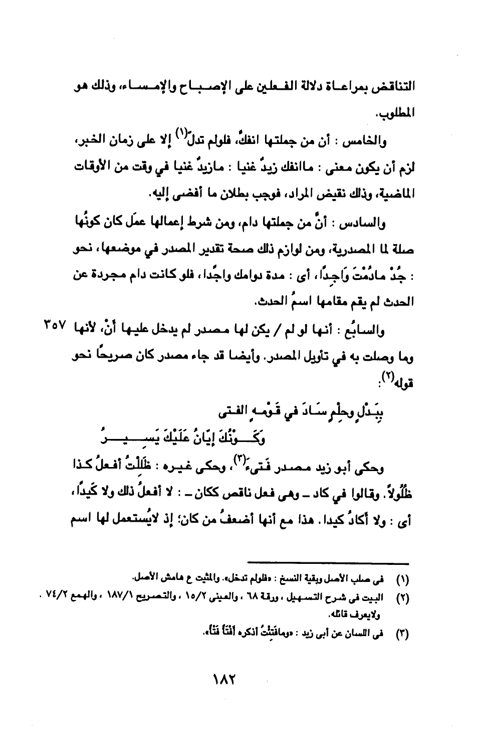 والسادس: أنّ من جملتها دام، ومن شرط إعمالها عمَل كان كونُها صلة لما المصدرية، ومن لوازم ذلك صحة تقدير المصدر في موضعها، نحو: جُدْ ما دُمْتَ وَاجِدًا، أى: مدة دوامك واجدًا، فلو كانت دام مجردة عن الحدث لم يقم مقامها اسمُ الحدث.