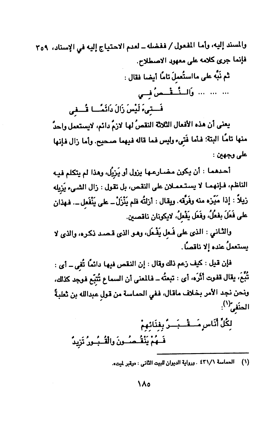فإن قيل: كيف زعم ذلك وقال: إن النقص فيها دائمًا تُفِى -أى: تُبِّعَ، يقال قفوت أثَرَه، أى: تبعتُه- فالمعنى أن السماع تُتِبّع فوجد كذلك، ونحن نجد الأمر بخلاف ما قال، ففي الحماسة من قولِ عبد الله بن ثعلبةً الحنَفِىّ: