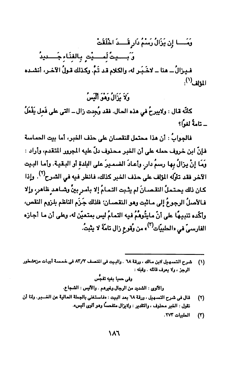 فالجوابُ: أن هذا محتمل للنقصان على حذف الخبر، أما بيت الحماسة فإنّ ابن خروف حمله على أن الخبر محذوف دلّ عليه المجرور المتقدم، وأراد: وَمَا إنْ يزالُ بِها رسمُ دارٍ. وأعادَ الضميرَ على البلدةِ أو البقية. وأما البيت الآخر فقد تأوّله المؤلف على حذف الخبر كذلك، فانظر فيه في الشرح. وإذا كان ذلك يحتملُ النقصانَ لم يثبت التمامً إلا بأمرٍ بين وشاهدٍ ظاهرٍ، وإلا فالأصلُ الرجوعُ إلى ما ثبت وهو النقصان؛ فلذلك جَزَم الناظم بلزوم النقص وأكّده تنبيهًا على أنّ ما يُتوهّمُ فيه التمامُ ليس بمتعيّن له، وعلى أن ما أجازه الفارسىّ في «الحلبيّات» من وُقوعِ زال تامّةَ لا يثبتُ.